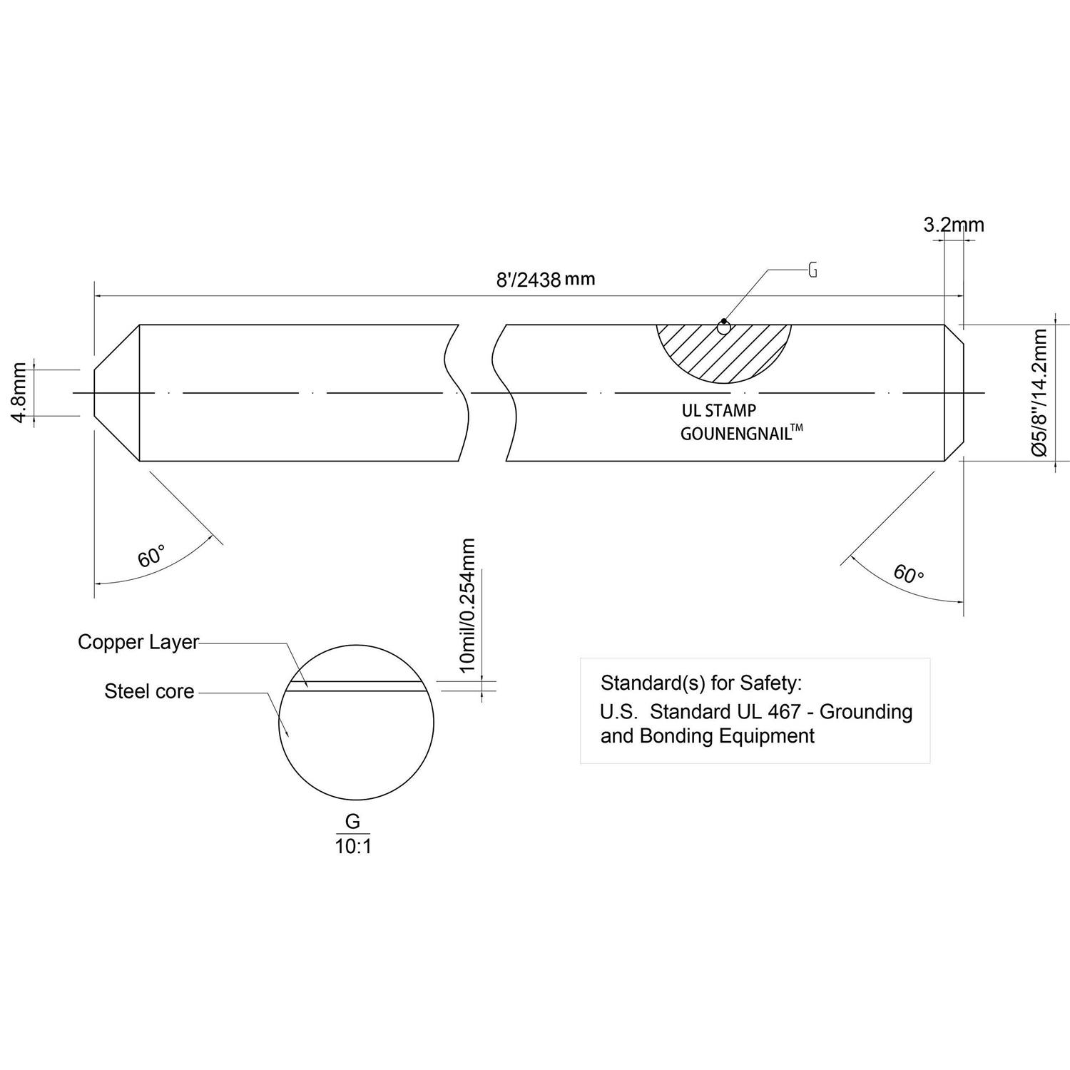 GOUNENGNAIL 8ft Ground Rod UL Listed 5/8” Bonded Electrical Copper Grounding Bar for Signal Tower Fence Lightning Strike Electrode Earthing Rod