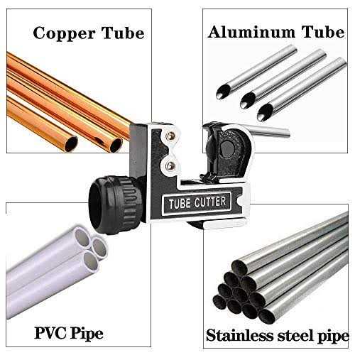 Mainly used for soft and hard copper, aluminum, brass and cut plastic tubes Specially designed for small diameter tubes in confined spaces The tube cutter has a sturdy, lightweight slide, wheel housing and large knurled screw knob for easy control of cutting pressure. Metal pipe cutting tool with 3-28mm 1/8 inch to 1-1/8 inch cutting capacity Anti-scratch electrostatic powder coating reduces the effects of static electricity during use.