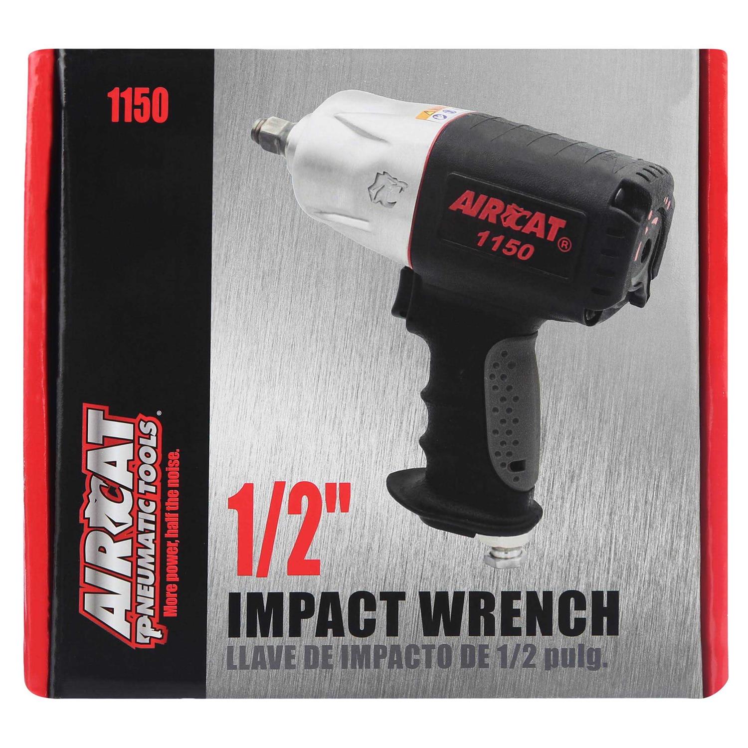 1/2″ killer torque air impact Wrench killer torque 1/2″ twin hammer air impact wrench with light-weight all black composite body and patented ergonomic Aircat handle. Features a 15% larger rotor and cylinder, and a patented tuned exhaust system which makes operating decibels lower without loss of power. Provides glancing impact which enables more impacts per minute. Durable and reliable, recommended for all-around automotive torque applications. Easy operation flip lever forward and reverse. Operates at 86 decibels with a loosening torque of 1295 ft/lb and a working torque of 200-950 ft/lb. Air flow pressure: 90-120 psi (pounds per square inch). Weight: 4.5 lb.