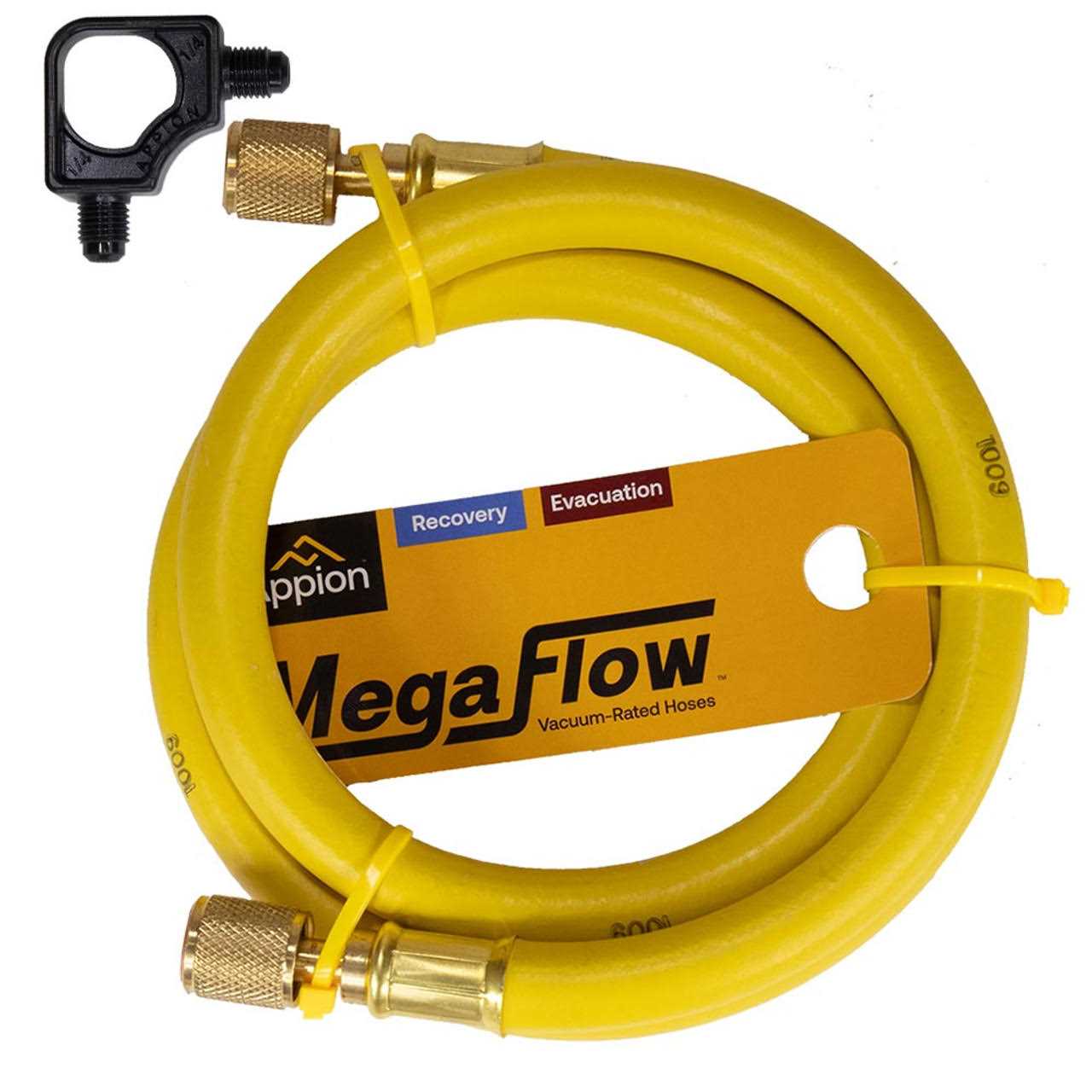 Appion MegaFlow 3/8in 4 ft Evacuation Hose 1/4 to 1/4 Ideal for Air Conditioning and Refrigeration MegaFlow 3/8in High-Speed Recovery Hose Increase the speed of your refrigerant recovery process by using the MegaFlow 3/8in High-Speed Recovery Hose. Features and Benefits Large 3/8in Internal Diameter for superior performance Short 4ft length Ultra-flexible for easy connections in tight spaces (small Ductless systems) Full Flow – more flow than a restrictive 1/4in charging hose Rated for use with R410A and all common refrigerants 4000 psi burst and 800 psi working pressure Vacuum-Rated to 20 microns Won’t permeate or collapse in a vacuum 1/4in FL fittings make it easy to connect to the Appion Refrigerant Recovery Pumps , Appion Valve Core Removal Tools and recovery tanks Larger Hoses for Refrigerant Recovery Even when restricted by 1/4in system ports, using a 3/8in hose greatly reduces resistance and increases potential flow . Don’t believe us? Click the link –> Full Flow to learn more about reducing recovery times. Save Hours , save Days , save Money . Internal Diameter: 3/8in Fitting Size: 1/4in Female Flare to 1/4in Female Flare Hose Length: 4ft
