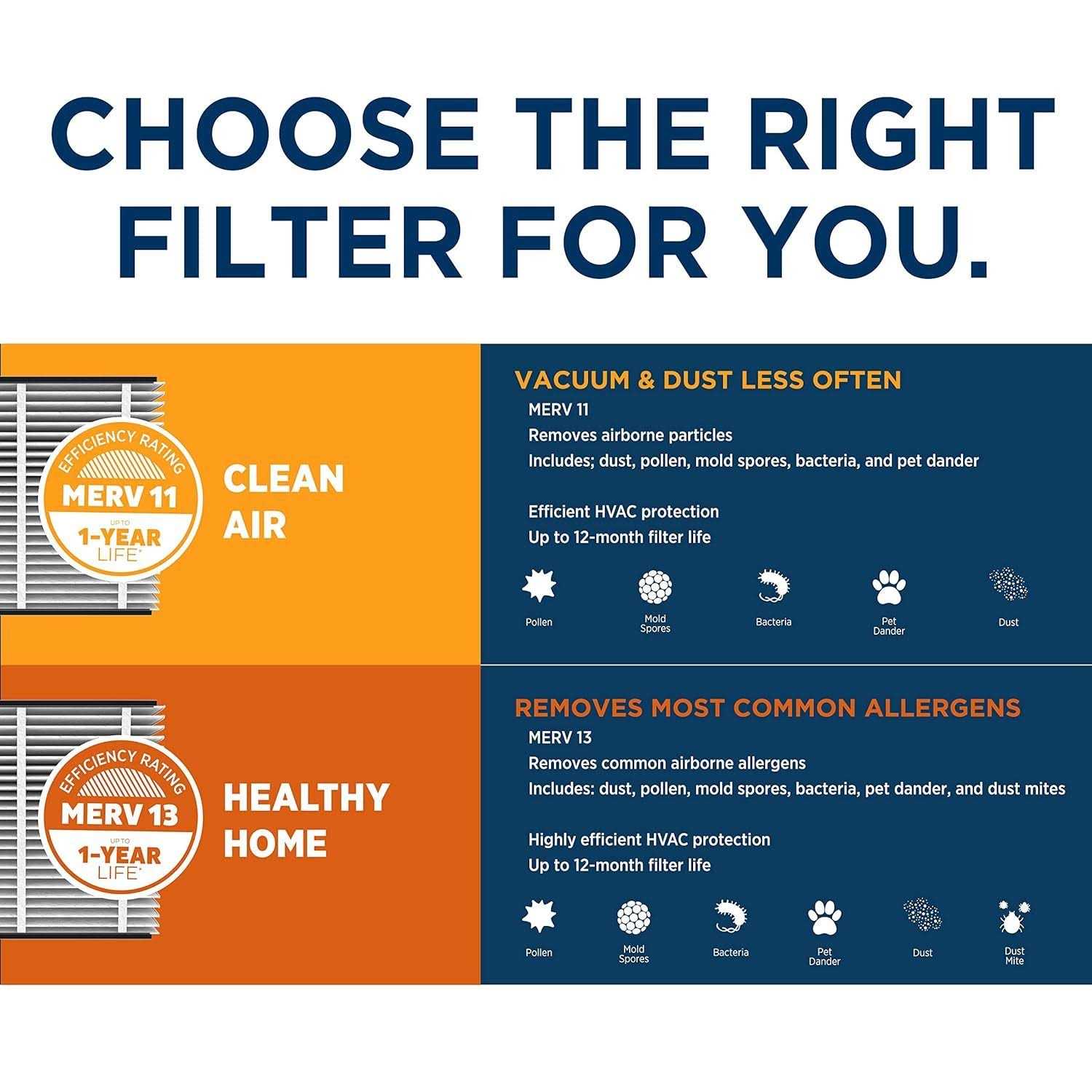 Your HVAC system is protected from airborne particles too, which helps lower your energy costs, and can prolong the life of your equipment. Genuine Aprilaire filters are specifically engineered to work with your Aprilaire air cleaner. They are effective for 6-12 months 1-3 month filter, saving you time and money. Our 4-inch filters provide more filter area for harmful particles to be captured 1-inch filters. Aprilaire’s patented self-seal technology assures no air will pass by unfiltered, keeping your home clean and the HVAC system operating at peak performance. Note: MERV is a scale used to measure the effectiveness of air filters. Higher number values translate to more effective filtration. Choose the Aprilaire Filter with the MERV rating that fits the needs of your family and home. *Performance tested to ASHRAE 52.2 Standard, minimum efficiency reporting value – MERV 11