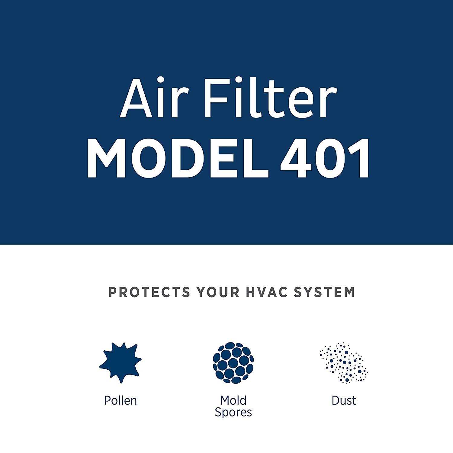 The 401 MERV 10 Air Filter helps capture and remove common airborne contaminants and allergy triggers. This replacement air filter is 6 in. thick with a large surface area for capturing pollutants and offering superior filtration to typical 1 in. filters. Filtering out airborne contaminants helps clean the air you breathe and can lower the frequency of cleaning and vacuuming by reducing dust buildup around the house. It also maximizes the lifespan of your heating and cooling systems, which can become inefficient with dust and particle buildup. The 401 filtering media is a surface-loading filter. This means that its efficiency increases with usage. The 401 Filter can last up to 2 years. If you run your HVAC system fan all day, every day, replace it after 12 months. It’s easy to swap out thanks to the new and improved ribbon design that holds the pleats to the proper spacing. Contaminants removed based on air passing through the filtering system; Performance tested to ASHRAE 52.2; Standard, minimum efficiency reporting value – MERV 10.