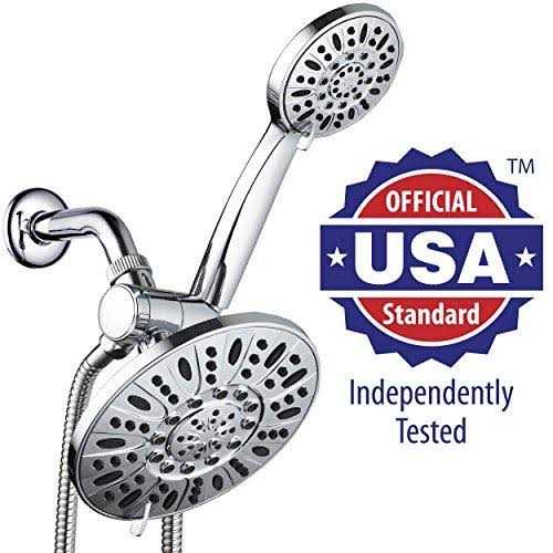 High pressure showerheads for maximum showering pleasure. Use shower heads separately or both together for your choice of 30 settings, 12 full and 18 combined water settings. 6 Full settings include power rain, pulsating massage, power mist, rain massage, rain mist, water saving pause mode. Premium 5 to 7 Ft. stretchable stainless steel hose for maximum reach with conical brass hose nuts for easy hand tightening. Patented 3 way water Diverter with anti-swivel lock nut. Connects in minutes to any standard overhead shower arm, no tools required.