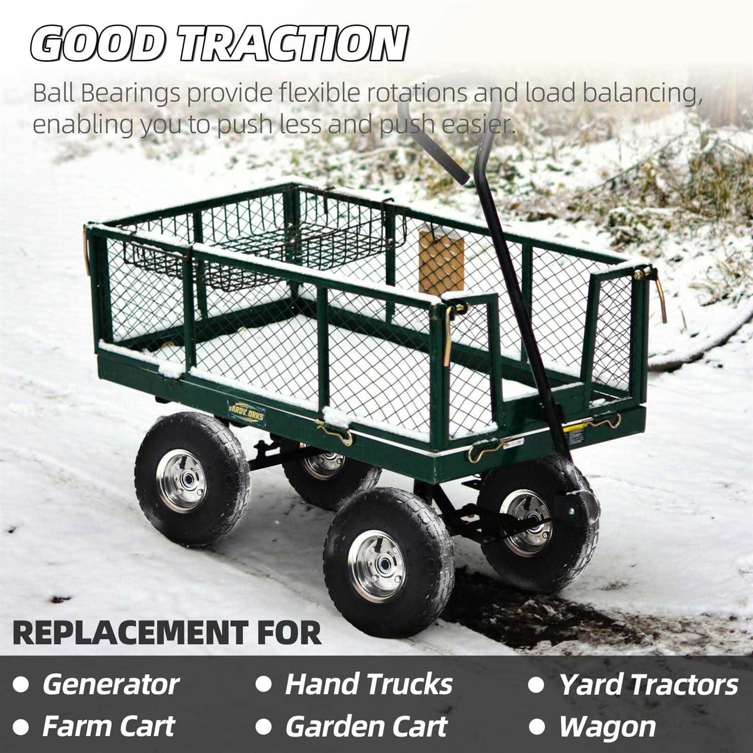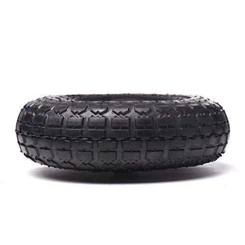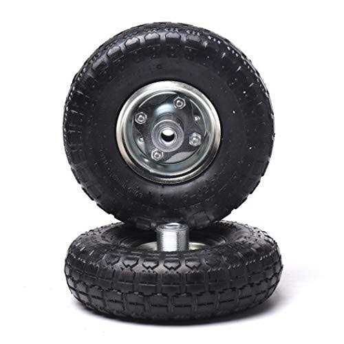 Pneumatic Wheels by AR-PRO. Details:This tire and wheel set comes aired and ready to install. With a size of 4.10/3.50-4 inches, a tire diameter of 10.3 inches, a tire width of 3.3 inches, 1 3/4 inches offset hub, and 5/8 inches axle bore hole, these tires are one of the most common size and type of tires used on hand trucks, lawn mowers, and other wheeled equipment. Used for both home and commercial purposes, these wheels have a maximum load capacity of 300 pounds and a PSI of 30. And although these wheels are heavy-duty, they aren’t designed for use as driving wheels. Instead, they are suitable for free- rolling applications including rear (idle) wheels for lawn mowers, hand truck wheels, and trail-behind attachments. The treads are perfect for outdoor use. Sawtooth treads provide maximum traction without harming grass. It also lasts longer and with its jagged tracks, it provides a solid grip on different terrains including turf, paved paths, dirt, and sand. Use these wheels in any…