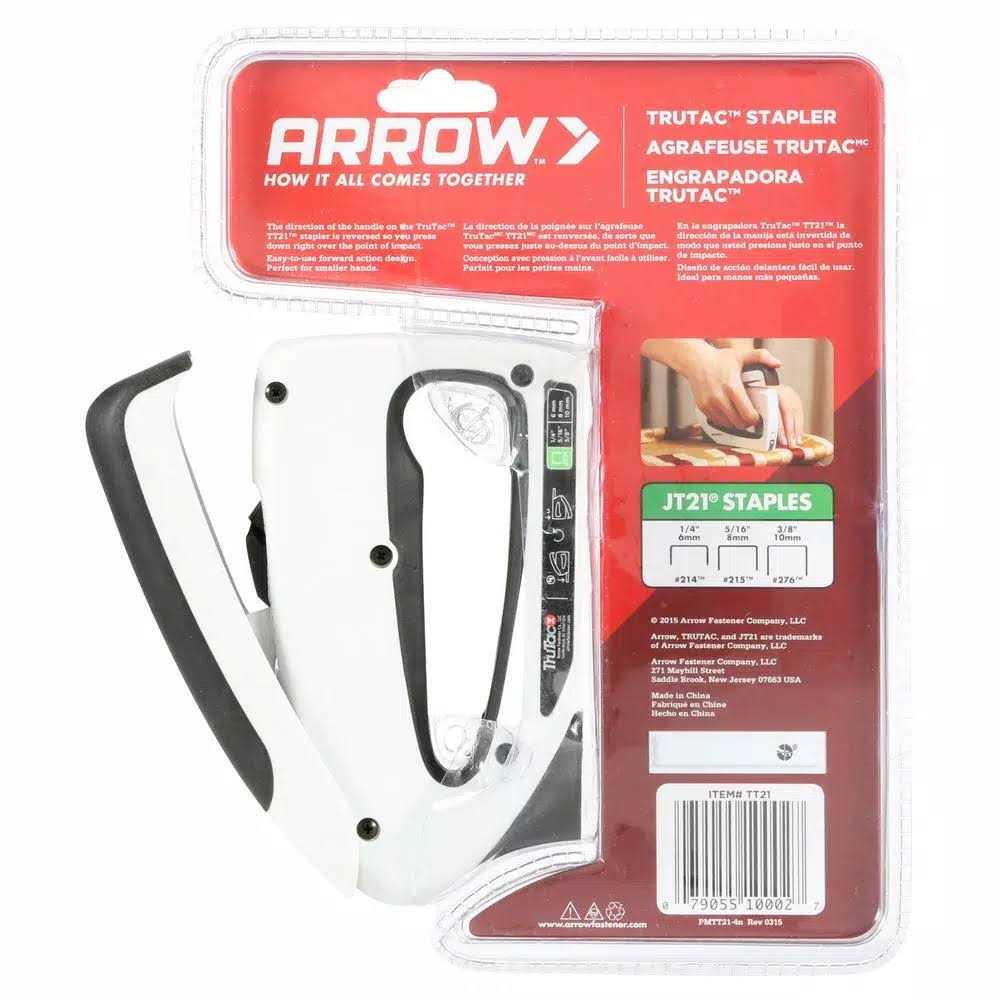The Arrow TruTac TT21 is a compact forward action staple gun suitable for home projects and supplied in a upholstery kit with tacks, staples and staple puller. The direction of handle is opposite to other staple guns so that you press down right over the point of impact allowing your body weight to assist. Its compact design allows you to get into awkward places as well as allowing for precise positioning of staples. The perfect tool for quick repairs around the house and workshop. Takes JT21 staples 6,8,10 and 12mm length. Supplied with stapler puller tool, 600 x 8mm J21 staples, 25 satin nickle and 25 flat black upholstery tacks.