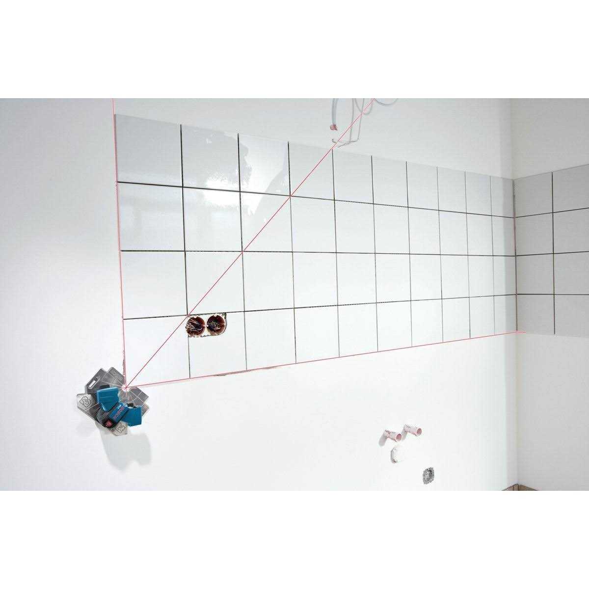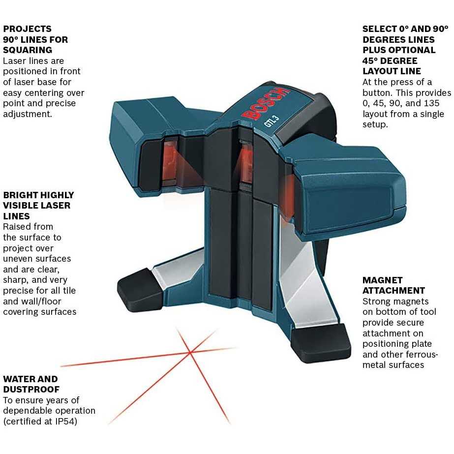 Projects 90-degree lines for squaring – laser lines are positioned in front of laser base for easy centering over point and precise adjustment Bright, highly visible laser lines Water and dustproof to ensure years of dependable operation (certified at IP54) Magnet provides secure attachment on positioning plate and other ferrous-metal surfaces This Wall/Floor Covering Laser produces highly visible laser lines lines that are easily seen on work surface and on adjacent surfaces in front of tool. Exclusive switchable 45 degree line helps verify proper positioning of square tiles between 0 and 90 degree. Also features magnetic attachment.