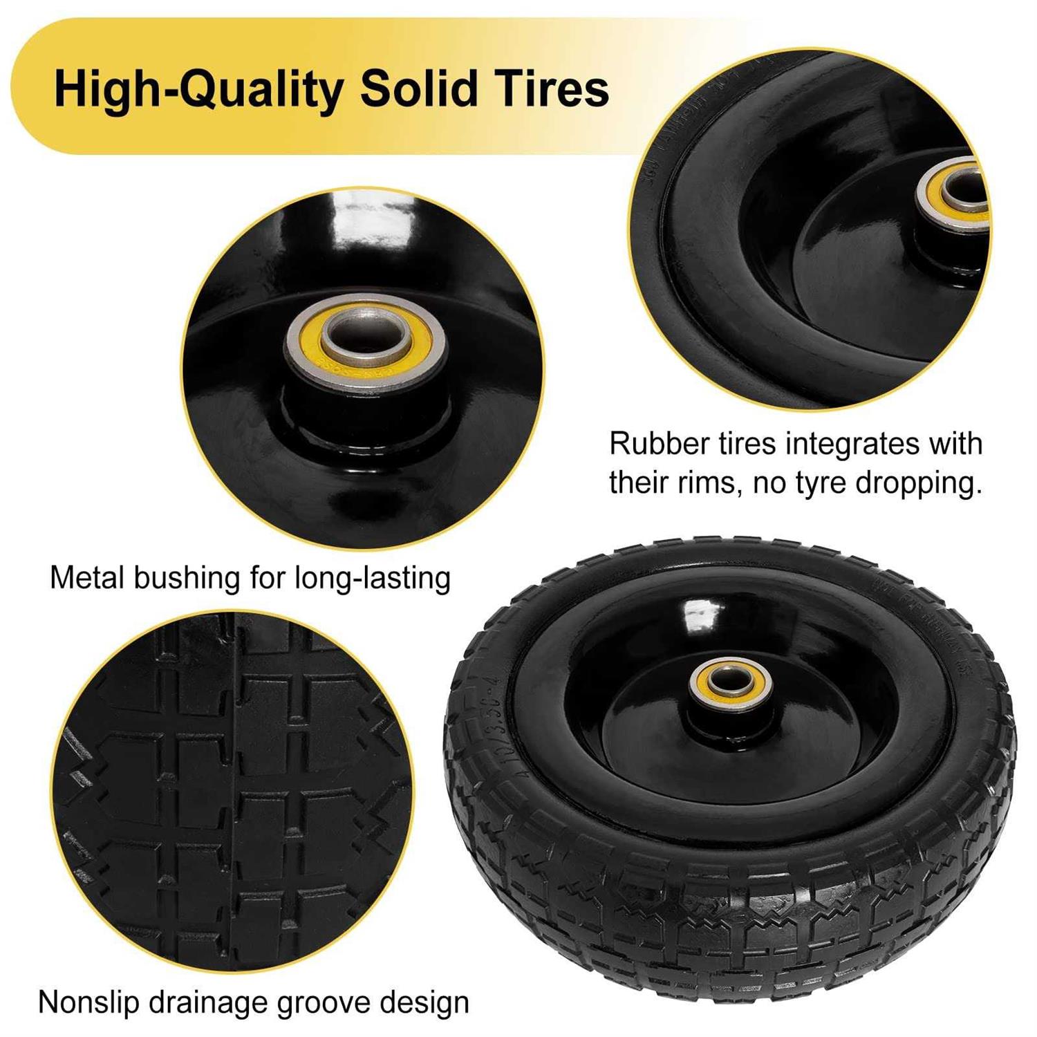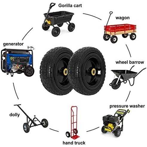 【Perfect Upgrade】Different from other brands of wheels, our solid tires integrate with their rims which keep tires from sliding off them. Also, rubber wheels’ spokes protrude to prevent the bottom of the tire from sagging, effectively avoiding flat spots on the tires. 【4.10/3.50-4″ Solid Wheels】4.10/3.50-4 tires compatible with cart, wagon, hand truck, dolly, snowblower, trolley, wheel barrow, generator, pressure washer, garden utility carts, wagons, and so on. Please check the part number engraved on your cart wheels before you order. 【Flat-Free Tire Advantages】No flat tires prevent flat spots from getting punctured or deflated. Tubeless wheels keep you away from the trouble of inflating tires frequently. Airless tyres feature 350 lbs load capacity. 【High-Quality Solid Tires】Made of high-quality polyurethane tires and iron hub. Our flat free foam tires are wear-resistant, shock-absorbent, impact resistant, nonskid, lightweight, and flexible. Solid tires without inner tubes – wheel diameter 10″, rim diameter 7-2/3″, axle bore diameter 5/8″, tire width 3-1/10″, hub length 2-1/5″.