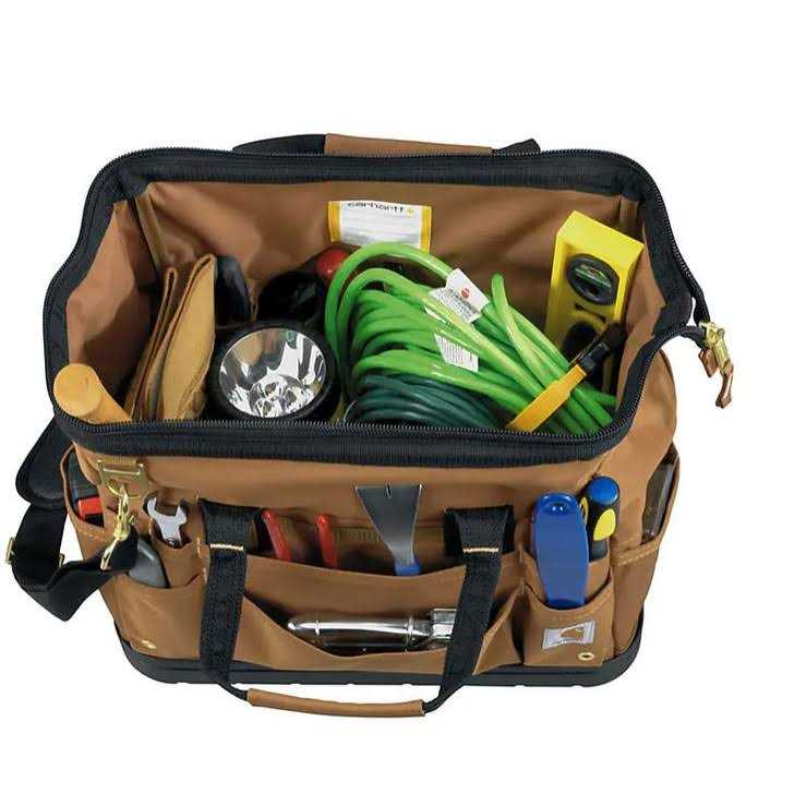 - Keep your frequently used tools safely and within reach by choosing this durable Carhartt 6-Molded Base Heavyweight Tool Bag Brown OS.