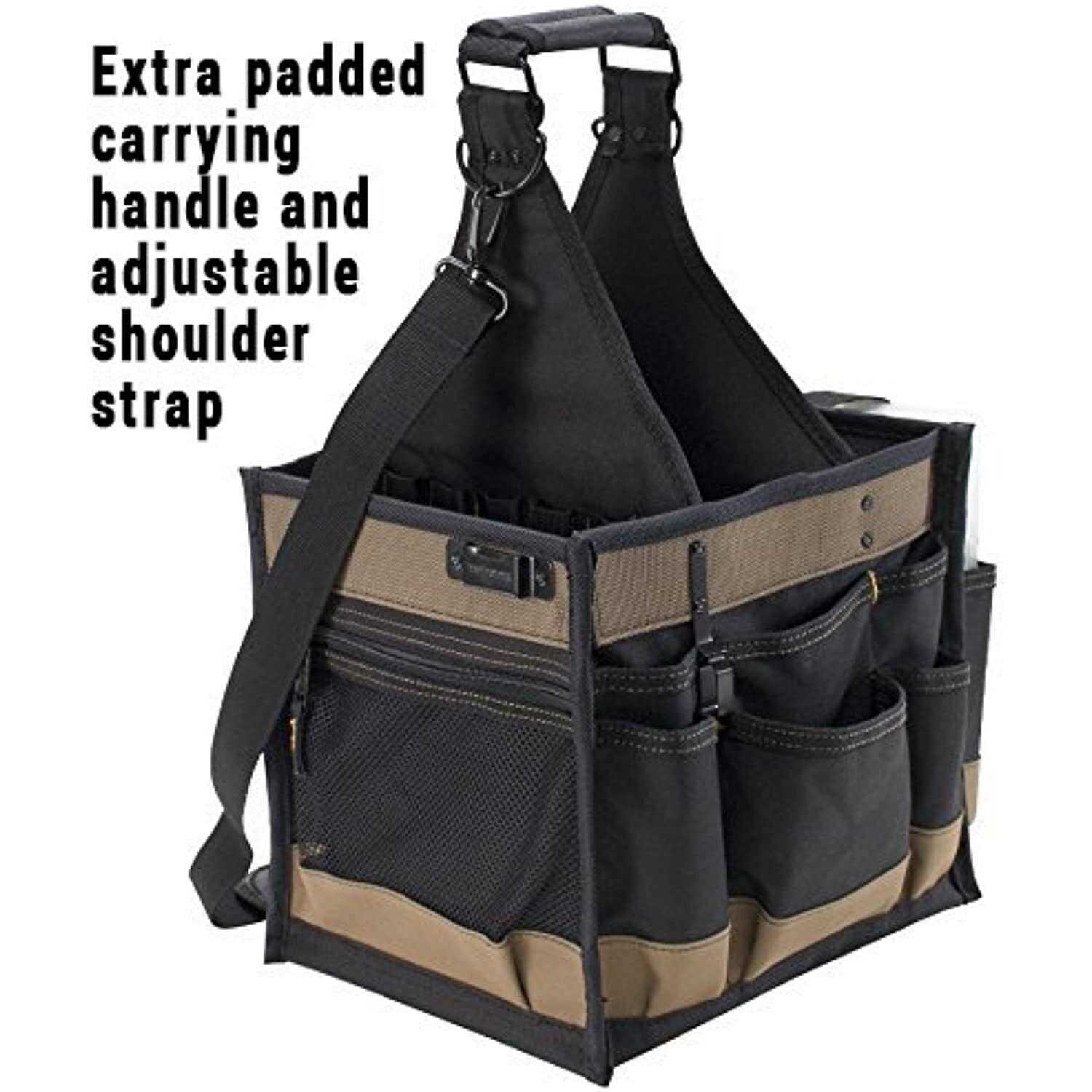 Have a durable carrier you can conveniently take with you to the job site with this 25-Pocket Electrical Maintenance Tool Carrier 1526 from Custom Leathercraft. Made of durable polyester it has 25 pockets and a 7″ x 5-1/2″ multi-compartment plastic tray that slides securely into the side of the pouch adding structure and storage space. Its box-shaped design prevents tipping and it’s constructed with heavy duty stitching for added reinforcement and strength. Perfect for storing tools drill bits tips and other supplies.
