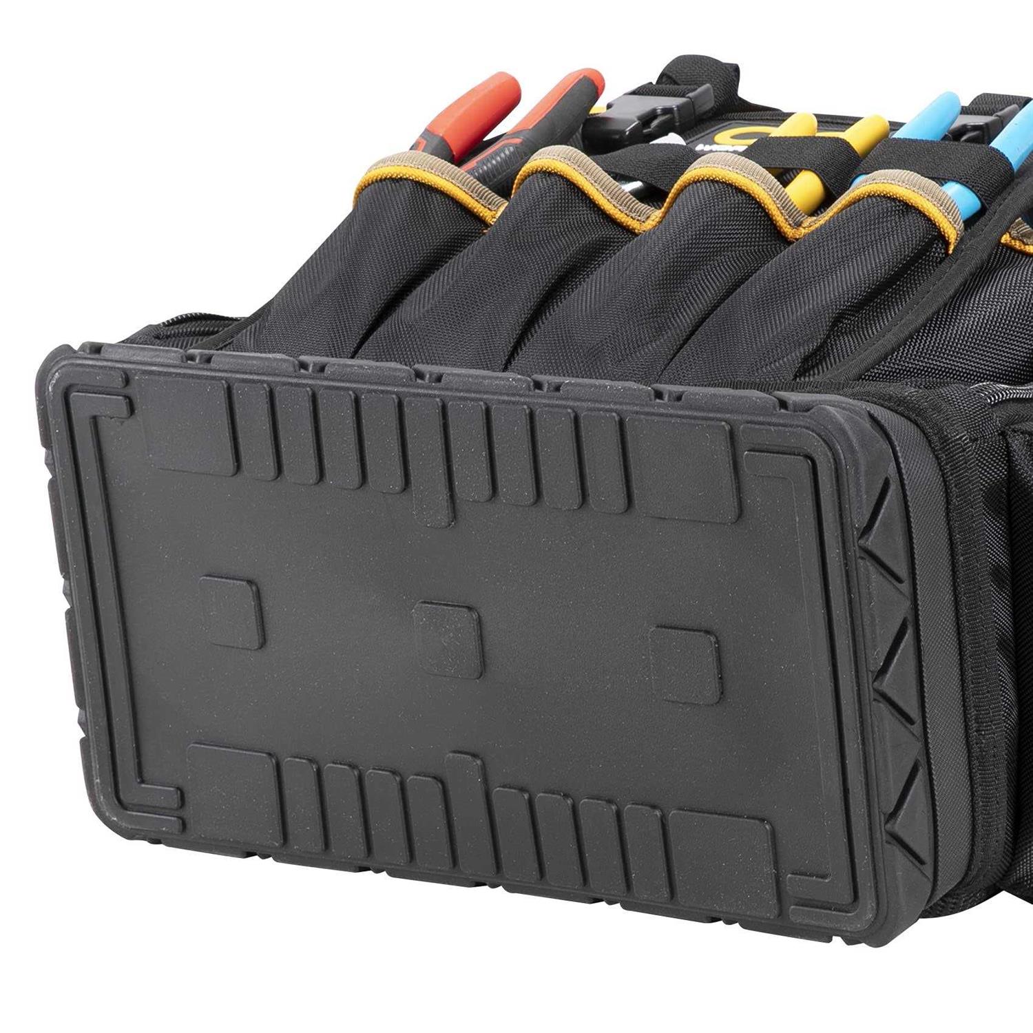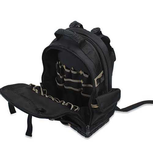 - The main front zippered compartment folds all the way down for easy access and has multiple pockets to organize tools and accessories.