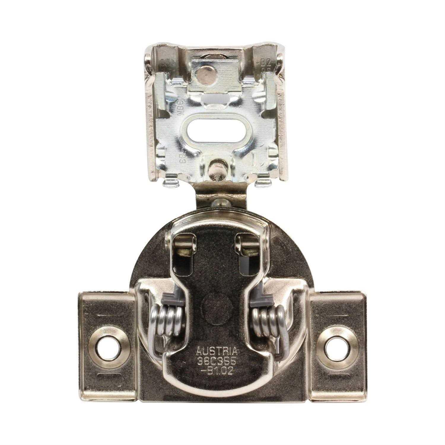 105 Degree Compact 38N Series Blumotion 5/8 in Overlay Screw-On Soft-Closing Cabinet Hinge – Requires a 3mm bore distance (the distance from the outermost edge of the door to the start of the hinge cup). One piece wraparound hinge (Search 38N355BE08 for edge mount hinge). BLUMOTION is integrated right into the hinge cup.Deactivation switch for small/lighter doors.Overload safety feature.105 degree opening angle.5/8 in overlay (1/8 in door protrusion), soft-closing.7/16 in (11mm) cup depth.Includes 2x #6 x 5/8 in Wood Screws .1x #10 x 3/4 in Wood Screw – Hardware & Fasteners, Blum, 105 Degree Compact 38N Series Blumotion 5/8 in Overlay Screw-On Soft-Closing Cabinet Hinge