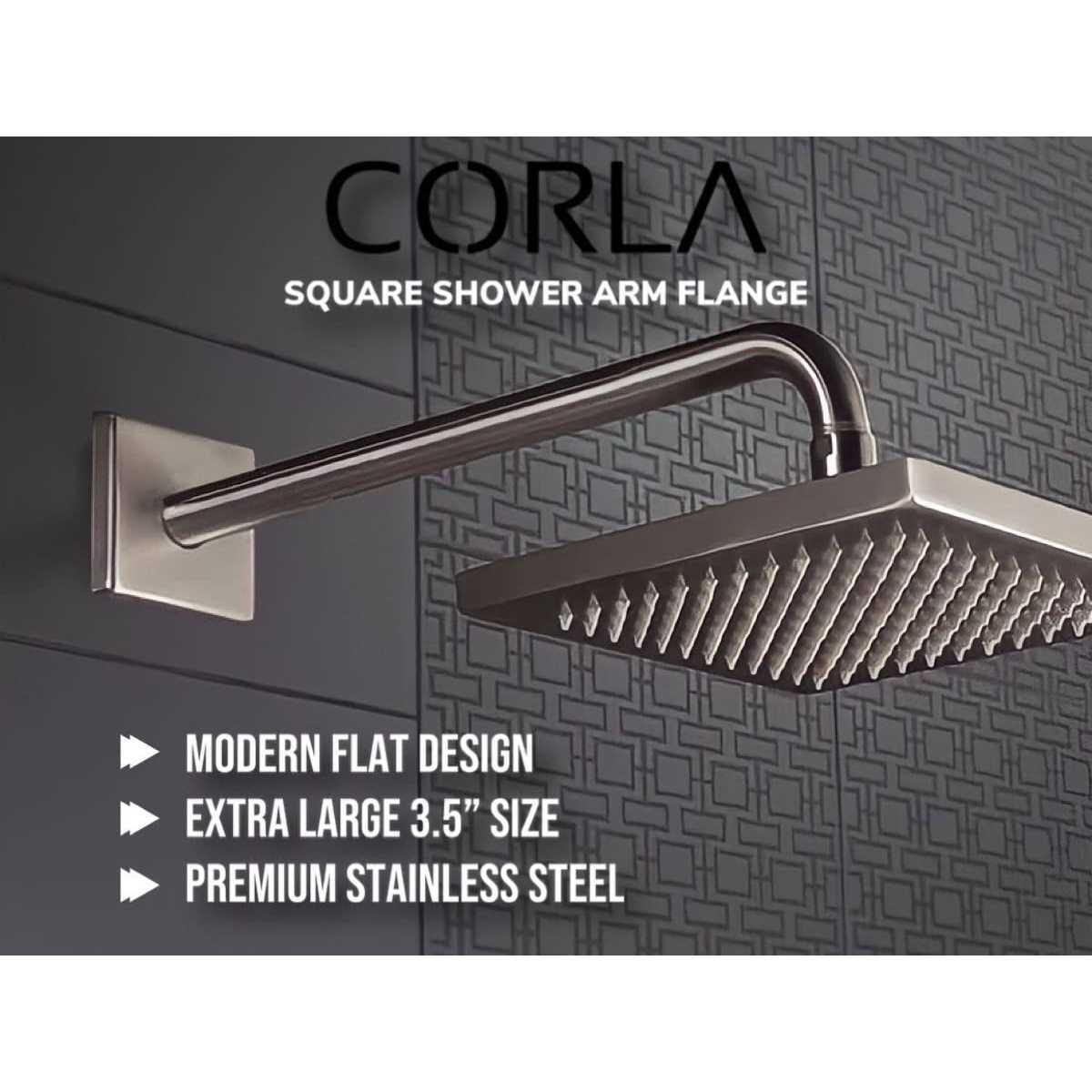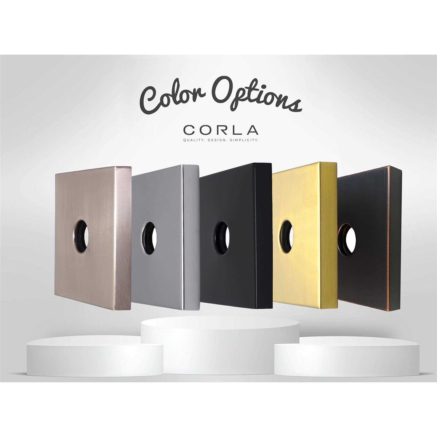 Easy to Install. Unique Finishes. Efficiency & Performance. Timeless Designs. Brilliant Finishes. Quality Craftsmanship. Variety of Styles. Look nowhere else. Corla combines quality, design and simplicity. Make a statement in your bathroom with the perfect finishing piece thanks to Corlas breadth of high-quality and durable bathroom and kitchen fixtures and finishes. Corla offers an array of finishes including: Brushed Stainless Steel, Polished Nickel, Chrome, Matte Black, Oil Rubbed Bronze, Brass and Gold. Our finishes match most high-end fixtures. Corlas universal oversized 3.5 inch shower arm flange fits all standard 1/2 inch pipes and is the perfect addition to upgrade your bathroom. Our exclusive design features a rubber gasket for a hassle-free installation, no tools required. From faucets to shower systems, toilets to bath accessories, you can depend on both striking design and uncompromising quality. Our wide range of bathroom fixtures and finishes with give your home the finishing touch it needs.