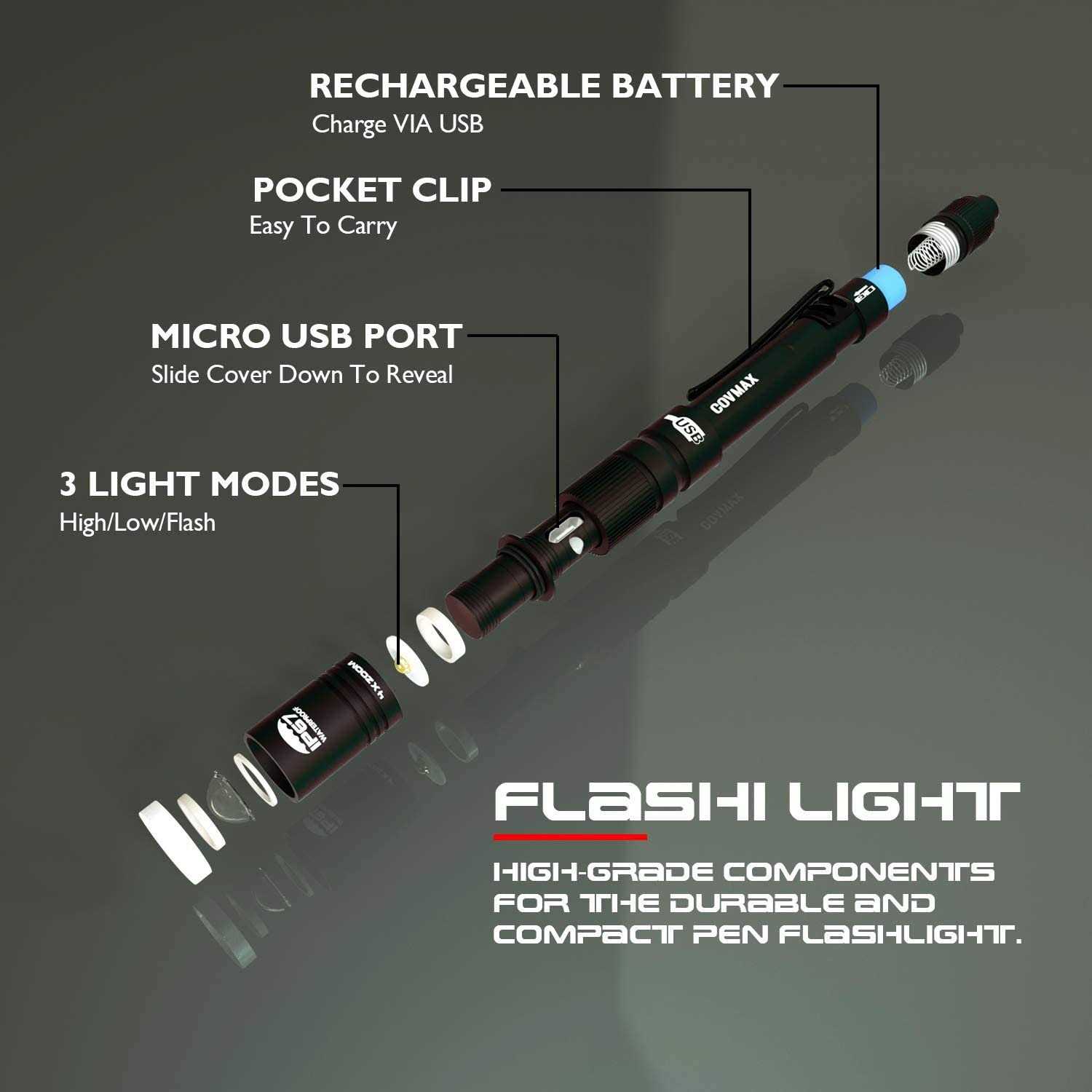 COVMAX Rechargeable Pen Light Flashlight IP67 Waterproof with Pocket Clip 4-Zoomable