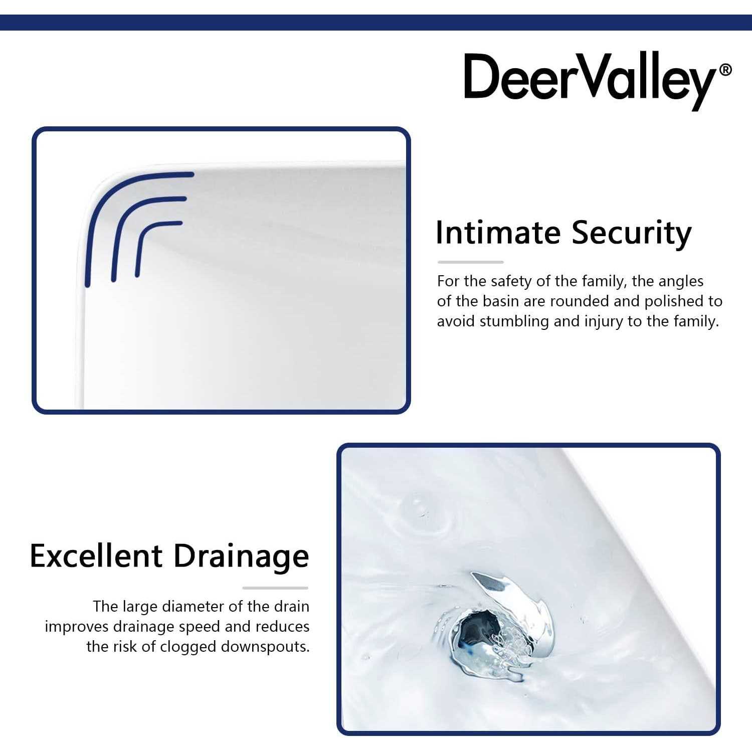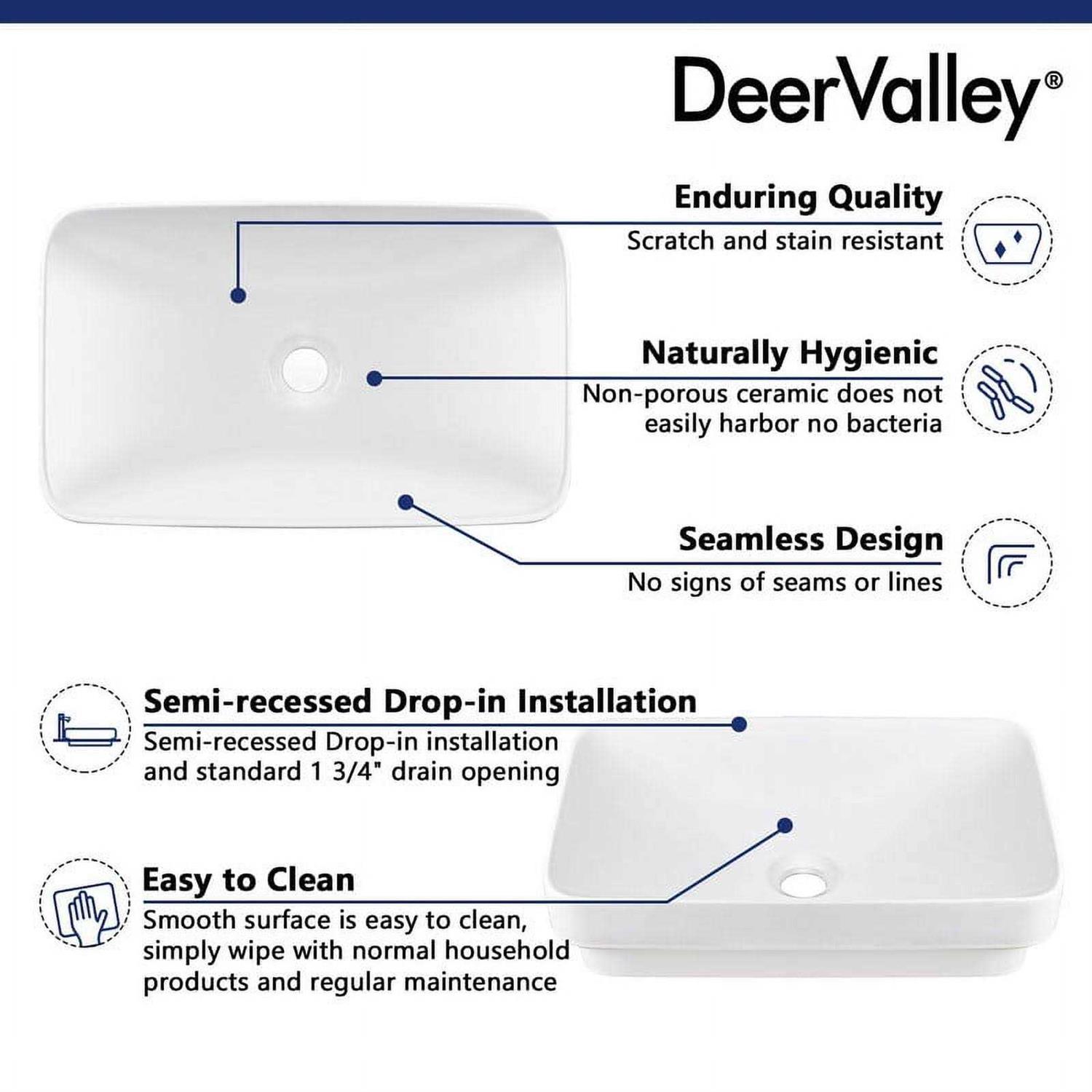 DeerValley The stylish semi-recessed vessel sink can provide a simple and cozy decoration style for your bathroom and is ideal for both commercial use and home use. Being made from premium ceramic material, the semi-recessed bathroom sink comes with a high-gloss, non-porous, enamel coating, making it more hygienic and easier to clean. And the extended length makes this bathroom vessel sink more convenient to use, and can effectively prevent water from splashing out. The flat bottom style has softly rounded corners to prevent a collision, making it safer to use.
