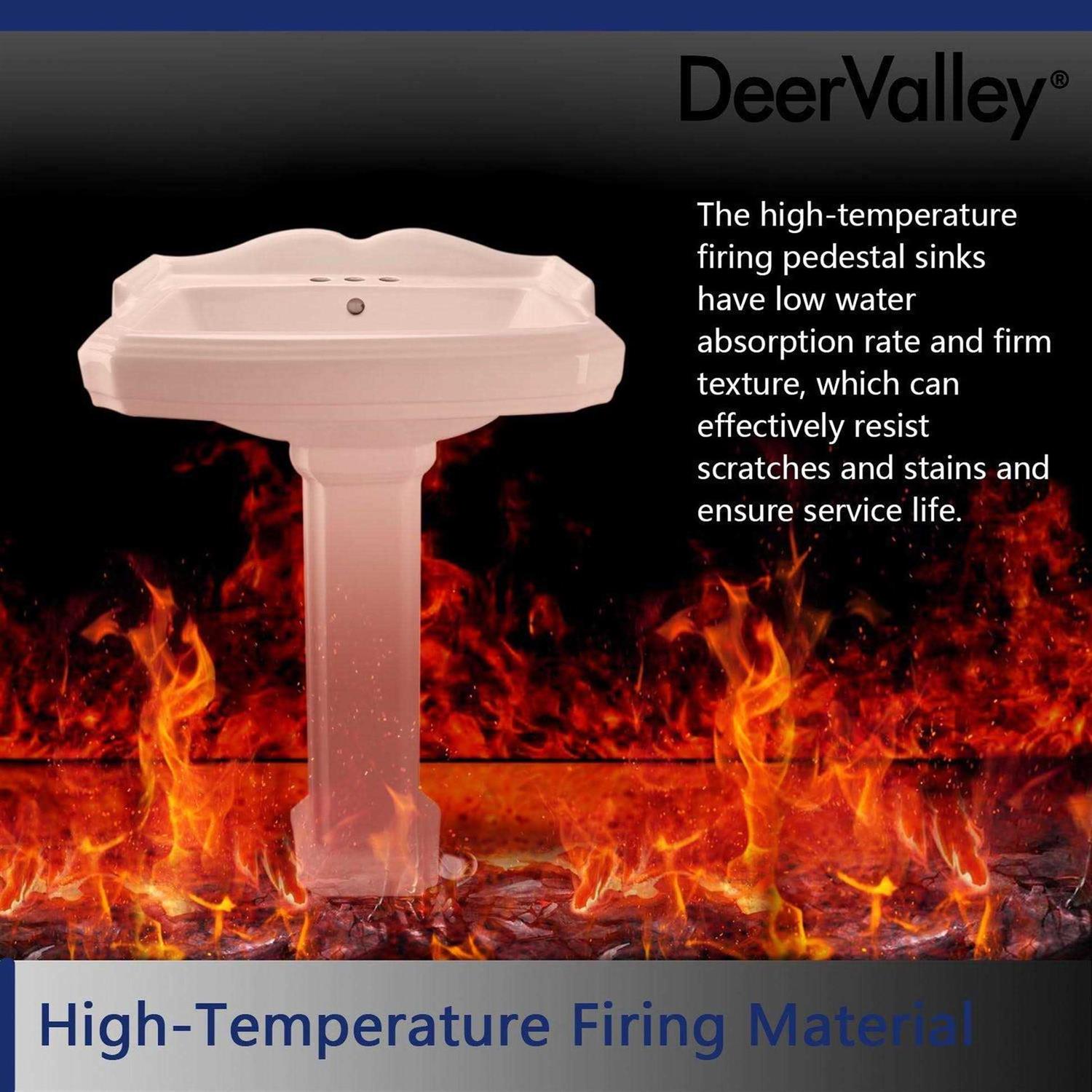 DeerValley This DeerValley freestanding pedestal bathroom sink has a very sophisticated and elegant shape with its cascading relief lines and waves undulating backrest design that often draws people in at first glance. Therefore, this white bathroom sink with a white base can be matched with a variety of decorative styles of bathrooms, enhancing both the exquisiteness of the bathroom and the sense of well-being in the home. More importantly, this vitreous china rectangular vessel bathroom sink with overflow is not only beautiful but also very practical. Made of vitreous china with high-temperature firing, this pedestal sink has a solid texture that effectively ensures longevity. The vitreous china pedestal sink comes with a high-gloss, non-porous enamel coating, which makes it more hygienic and easy to clean.