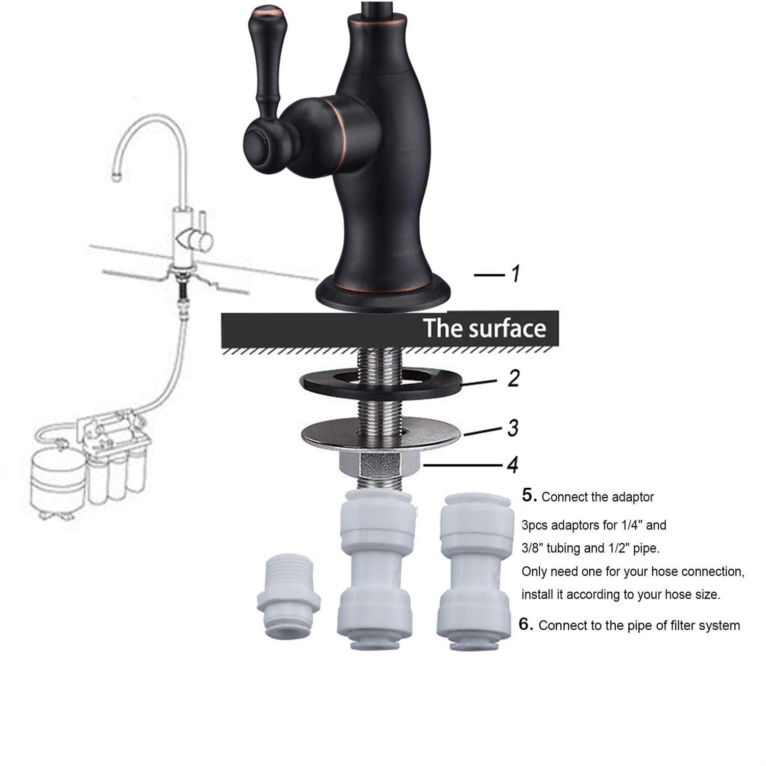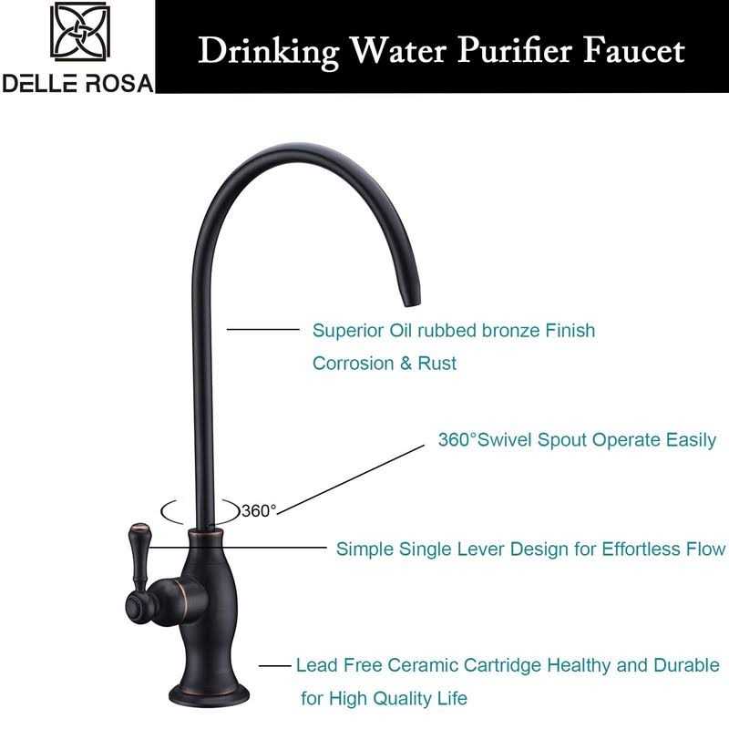 Drinking Water Purifier Faucet Delle Rosa Commercial Water Filtration Faucet for Under Sink Water Filter System Modern Lead Free Brass Oil Rubbed Bronze Kitchen Bar Sink Drinking Water Faucet Brand Delle Rosa Plug Profile Deck Mount Material Brass, Metal Finish Type Oil rubbed bronze Handle Type Lever Handle Material Metal Spout Reach 5.71 Inches Number of Handles 1 Number Of Holes 1 Spout height 8.86 inch, spout reach 5.71 inch, overall height 11.73 inch Easy to Self-install. Mounting hardware are included, 3pcs quick connect adaptors for 1/4″, 3/8″ and 1/2″ connectors.can fit to the counter top thickness < 5cm/1.6inch. Non-Air Gap. No hose included Oil Runbbed Bronze finish resists tarnish and corrosion; Lead-free solid brass and ceramic cartridge. Ceramic valve core! Professional water purifier faucet for under sink water filter system Easy to Maintenance: Superior corrosion & rust-resistant finish prevent dirty from sticking to faucet surface, clean faucet by cloth is enough in Daily Use.