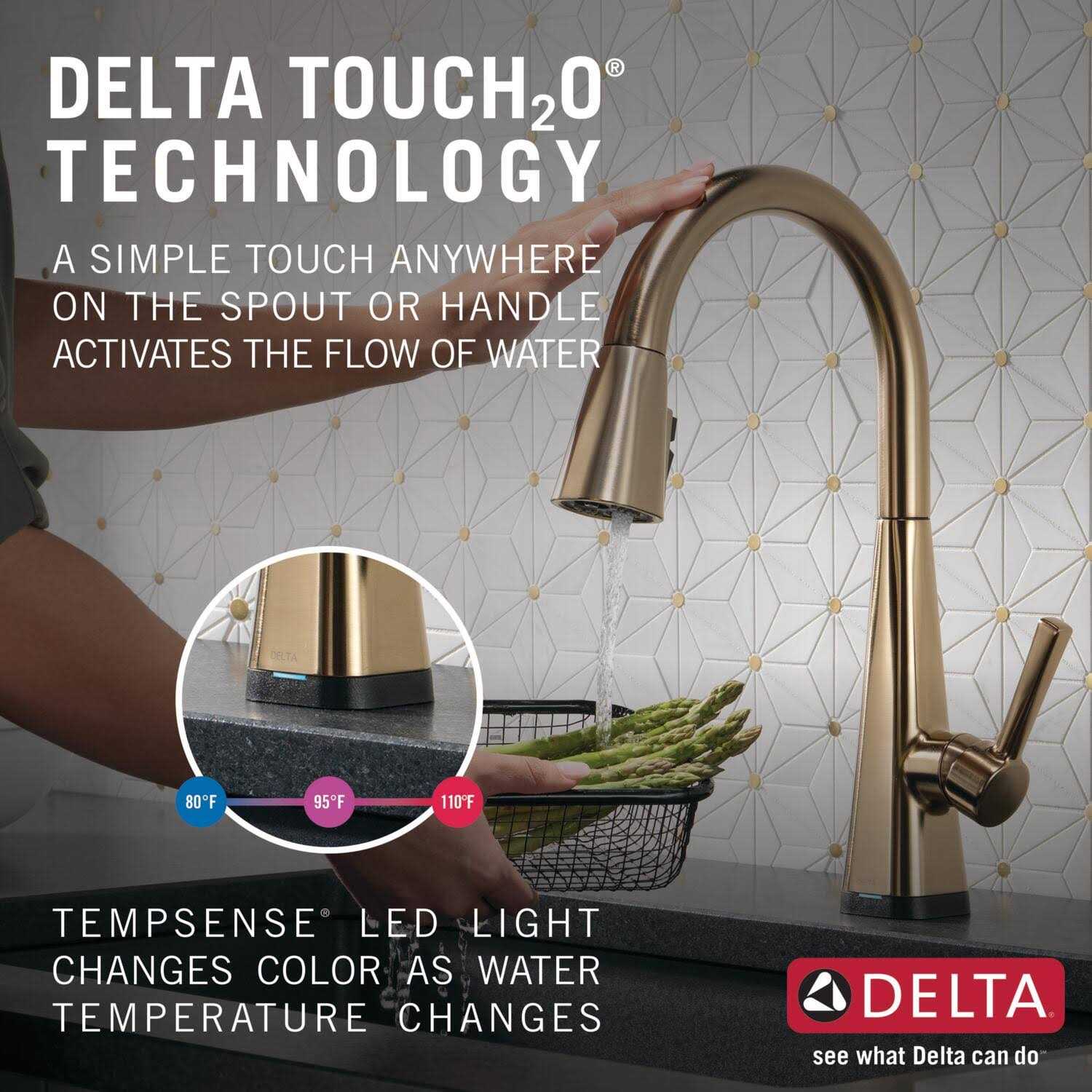 Touch it on. Touch it off. Whether you have two full hands or 10 messy fingers delta touch2o technology helps keep your kitchen faucet clean even when your hands arent. A simple touch anywhere on the spout or handle with your wrist or forearm activates the flow of water at the temperature where your handle is set. The delta temp sense led light changes color to alert you to the waters temperature and eliminates any possible surprises or discomfort. Kitchen sink faucets with touch-clean spray holes allow you to easily wipe away calcium and lime build-up with the touch of a finger. Delta shield spray technology cleans with laser-like precision while containing mess and splatter. A concentrated jet powers away stubborn messes while an innovative shield of water contains splatter and clears off the mess so you can spend less time soaking scrubbing and shirt swapping. Delta kitchen faucets with diamond seal technology perform like new for life with a patented design which reduces leak points is less hassle to install and lasts twice as long as the industry standard*. Kitchen sink faucets with touch-clean spray holes allow you to easily wipe away calcium and lime build-up with the touch of a finger. *Industry standard is based on ASME a112.18.1 of 500000 cycles.