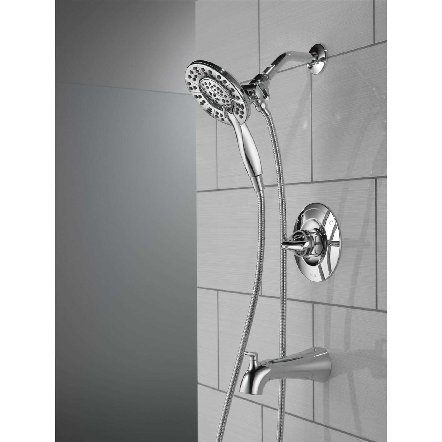 The fluid lines of the Arvo Bath Collection bring a delicate, serene look to the bath. The Delta In2ition 2-in-1 Shower features a detachable hand shower which can be used separately from or simultaneously with the shower head. This integrated dual-functionality gives you maximum flexibility without sacrificing warmth, as you can choose to have water streaming from the shower head only, the hand shower only or both the shower head and hand shower at once. While other products may gather unsightly mineral build-up over time, Delta soft rubber Touch-Clean spray holes allow any mineral residue to simply be wiped away for an instantly refreshed look – with no need for soaking or the aid of chemical cleaners. The pause setting gives you ample space for shaving, lathering and other shower tasks, then easily restarts the water with the temperature where you left off. This spray setting helps you conserve water, so you can worry less about depleting your supply of hot water – and you help the environment too. Delta WaterSense labeled faucets, showers and toilets use at least 20% less water than the industry standard-saving you money without compromising performance. Color: Chrome.