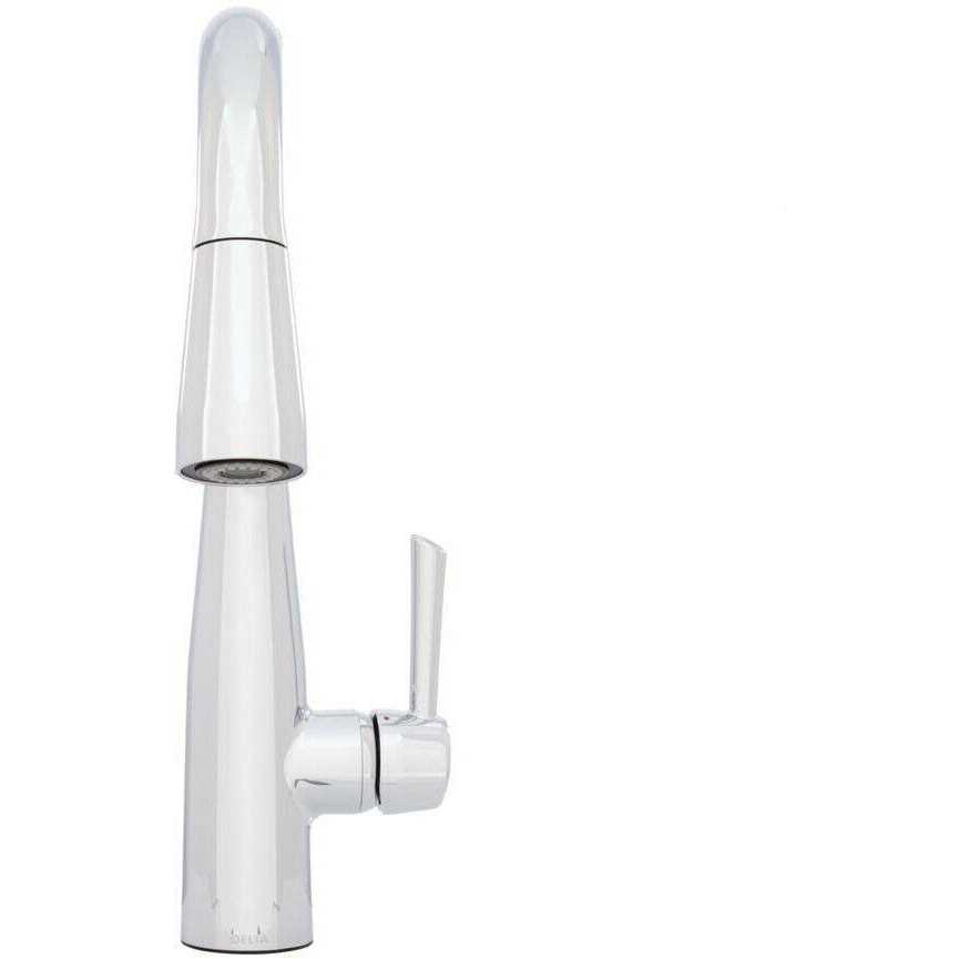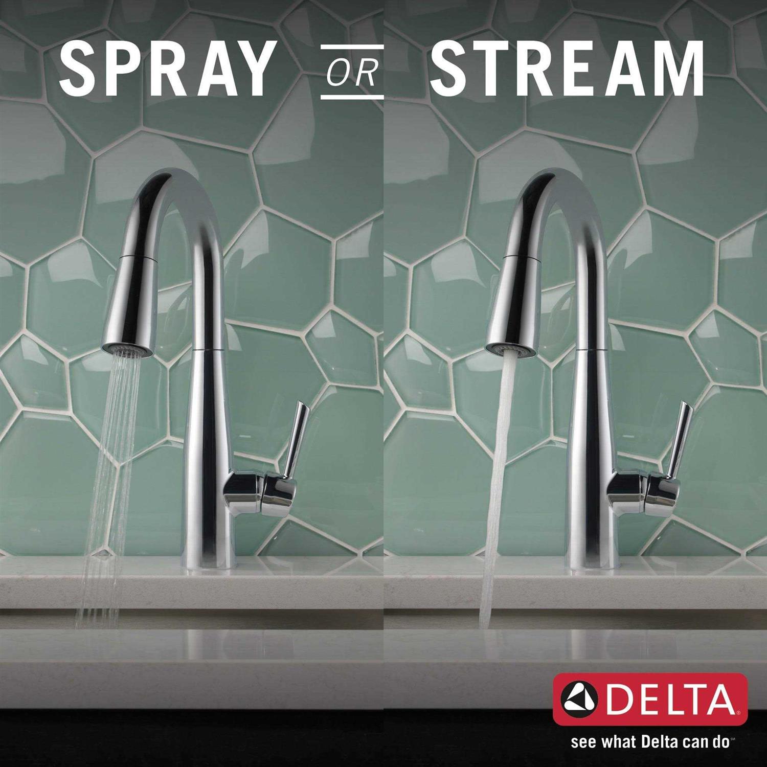 This Essa Single-Handle Bar Faucet in Chrome with MagnaTite Docking features a soft contemporary take on a euro design with subtle detailing accents that allow the faucet to blend with contemporary and transitional design. The pull-down spray wand comes free with a gentle tug and gives you total flexibility. The hose extends and retracts without friction points, fed by gravity. As you raise the wand to dock it, the magnet embedded in the spout pulls the wand precisely into place. So, unlike other pull-downs that tend to droop over time, MagnaTite keeps your pull-down faucet looking picture-perfect. Delta’s exclusive DIAMOND Seal Technology uses a valve with a tough diamond coating. InnoFlex PEX waterways keep water inside the faucet out of contact with potential metal contaminants. This powerful combination brings you a faucet built to last up to five million uses. Only Delta faucets are equipped with Touch-Clean soft, rubber nubbins that allow you to easily wipe away calcium and lime build-up with the touch of a finger.