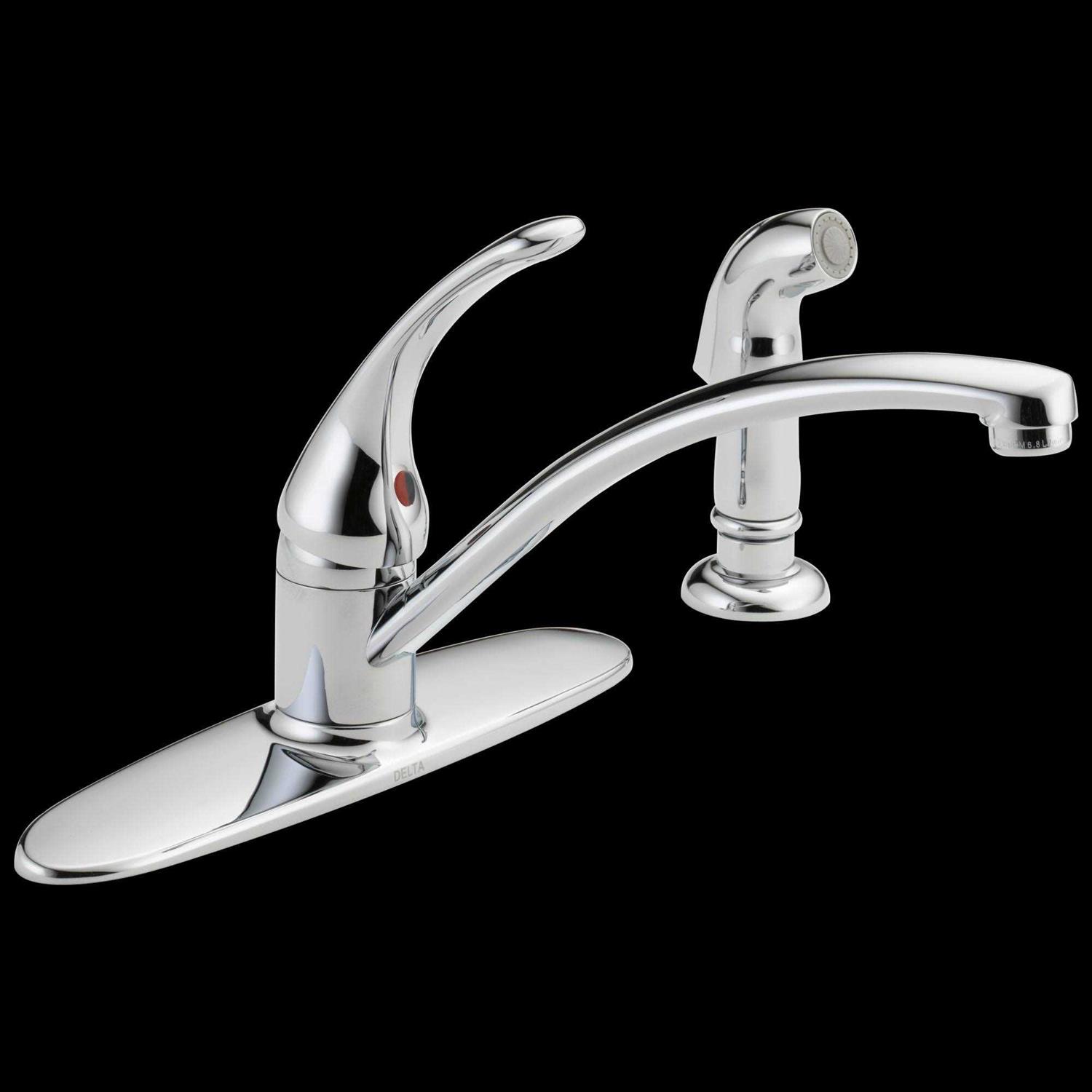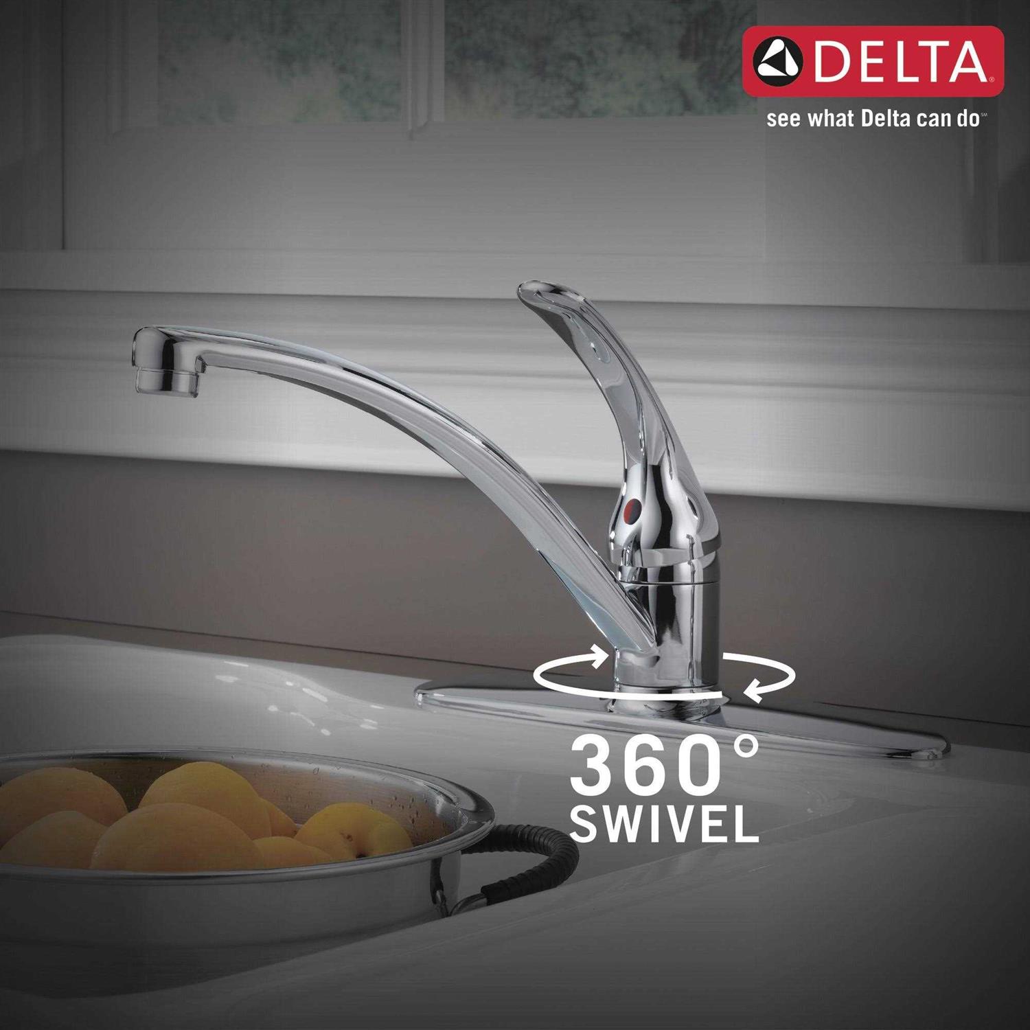 From the delicate oval base to the slightly curved handle and beautifully arced spout, this Delta faucet will bring form to function and dress up any kitchen with style. The single-lever handle features a red/blue temperature indicator and moves smoothly from side to side for quick adjustments. The spout swivels an amazing 360? for convenient filling and rinsing anywhere within reach; it can even be adjusted to give you a 1.5 gpm aerator for maximum rinse power. It comes with a separate sprayer to extend your reach in and around the sink, and everything is finished in a gorgeous, classic chrome.