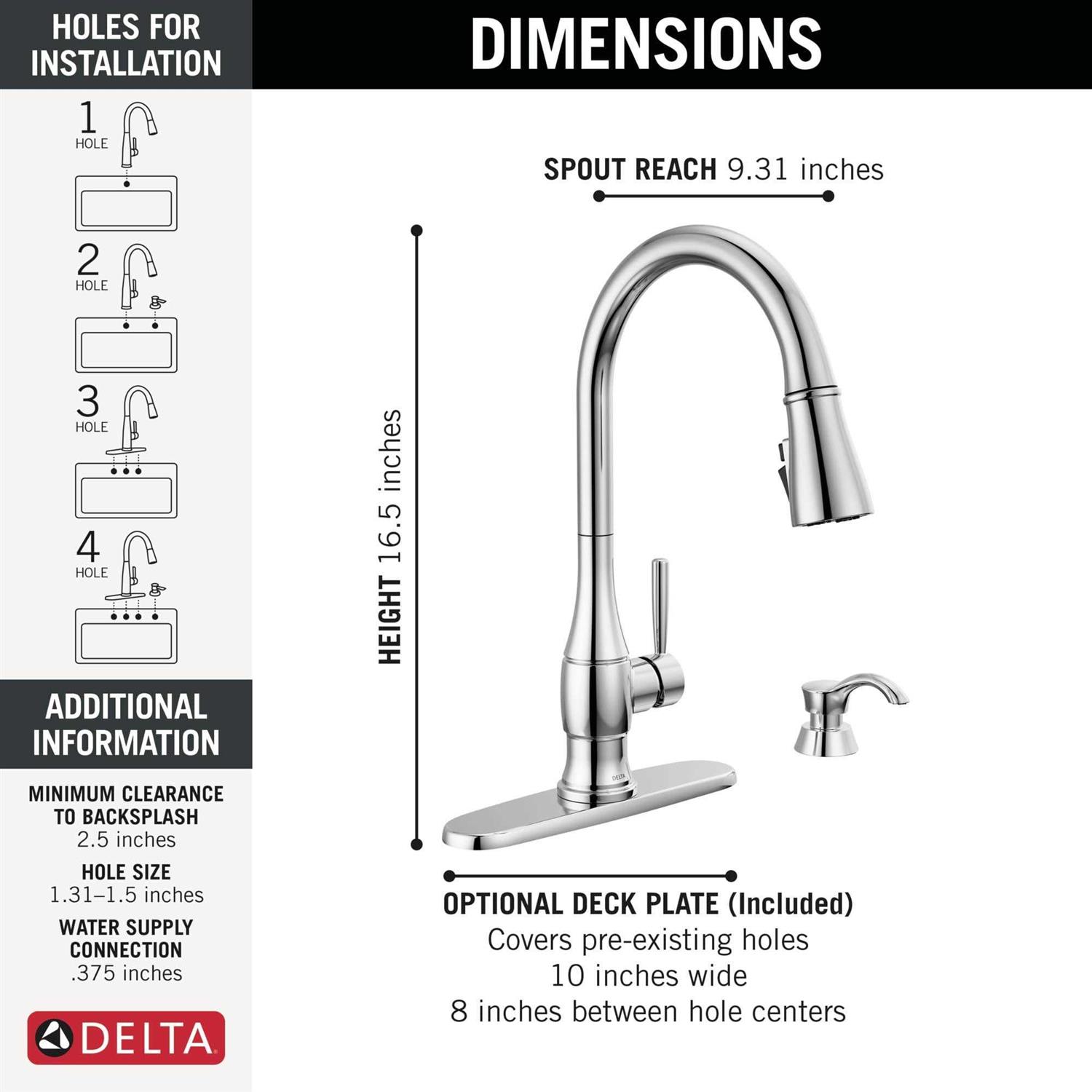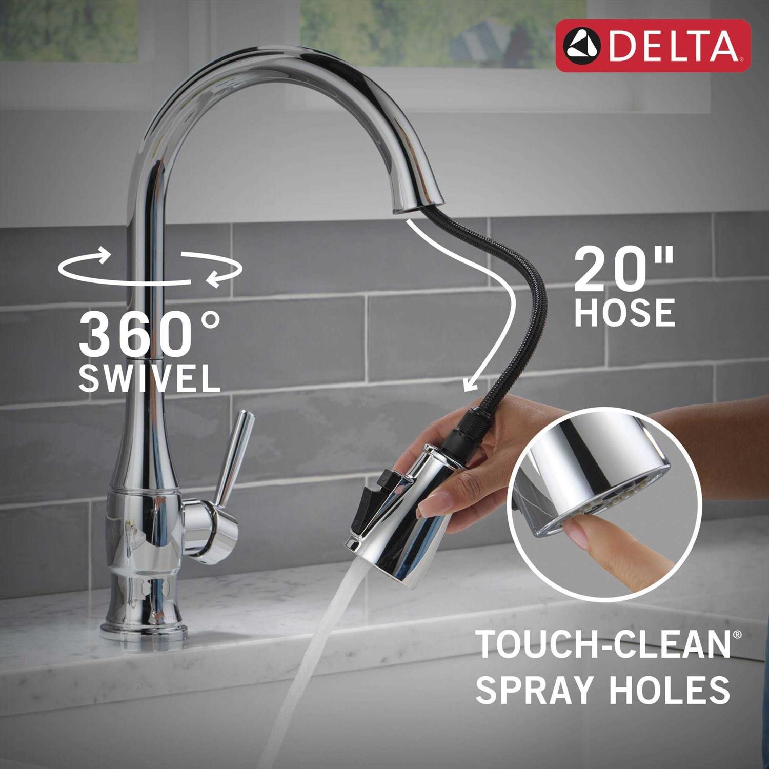 Bring delicate details and flowing lines to your kitchen with the Hazelwood Kitchen Faucet. MagnaTite Docking uses a powerful integrated magnet to set your pull down sprayer precisely into place and hold it there so it stays docked when not in use. ShieldSpray Technology uses a concentrated jet to power away stubborn messes while an innovative shield of water contains splatter and clears off the mess, so you can spend less time soaking, scrubbing and shirt swapping. Delta kitchen faucets with Diamond Seal Technology perform like new for life with a patented design which reduces leak points, is less hassle to install and lasts twice as long as the industry standard.