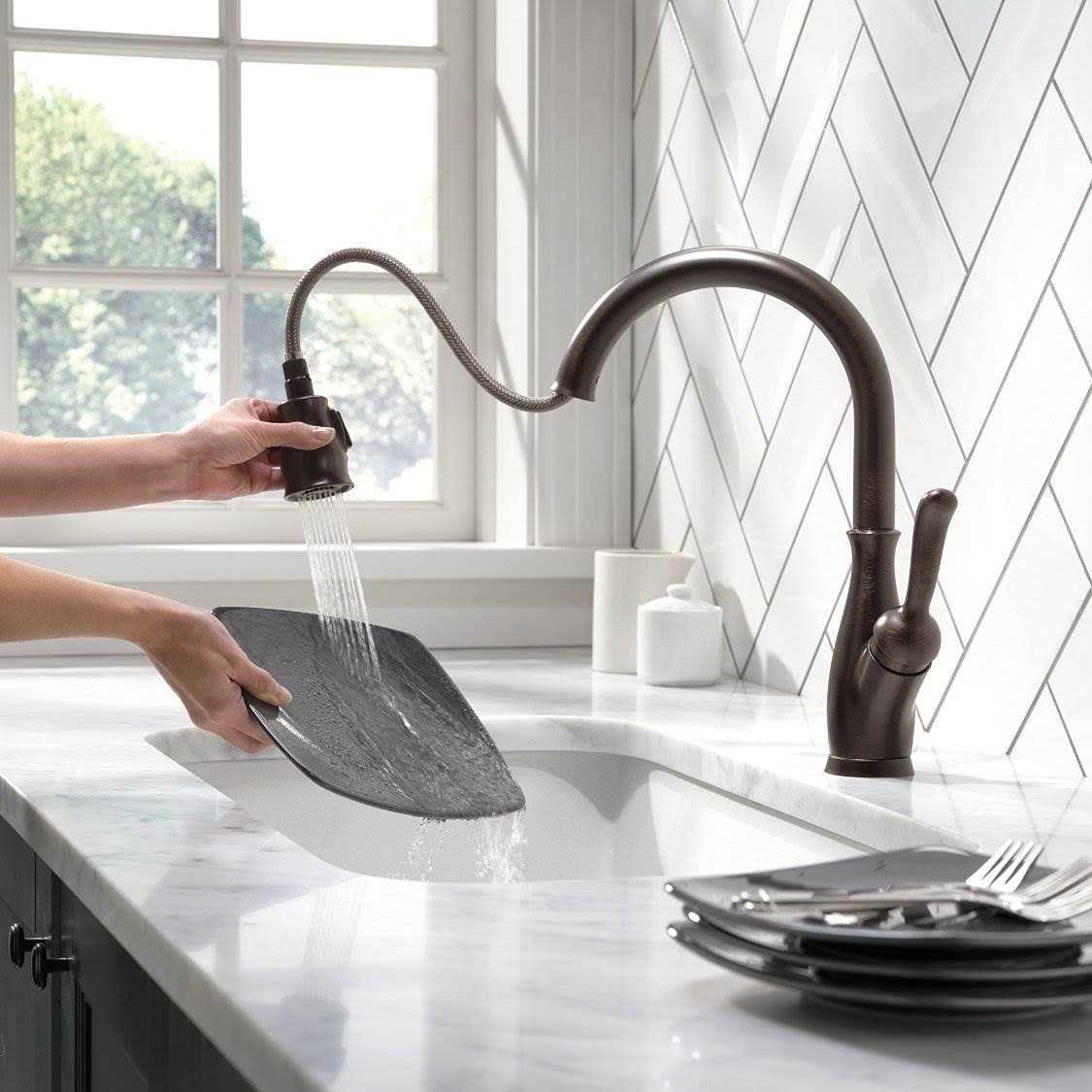 Bar/prep faucets go beyond the kitchen to butler’s pantries morning kitchens and more. With Leland traditional styling and modern functionality come together in dramatic fashion for a timeless look. The Delta-exclusive MagnaTite docking system keeps the spray wand securely in place for picture-perfect grace. Put water right at hand. Nobody offers a wider range of pull-out and pull-down kitchen faucets. Delta’s exclusive Diamond Seal Technology uses a valve with a tough Diamond coating to bring you a faucet built to last up to five million uses. Plus it keeps water inside the faucet out of contact with potential metal contaminants. Who knew a faucet could be just as beautiful on the inside?