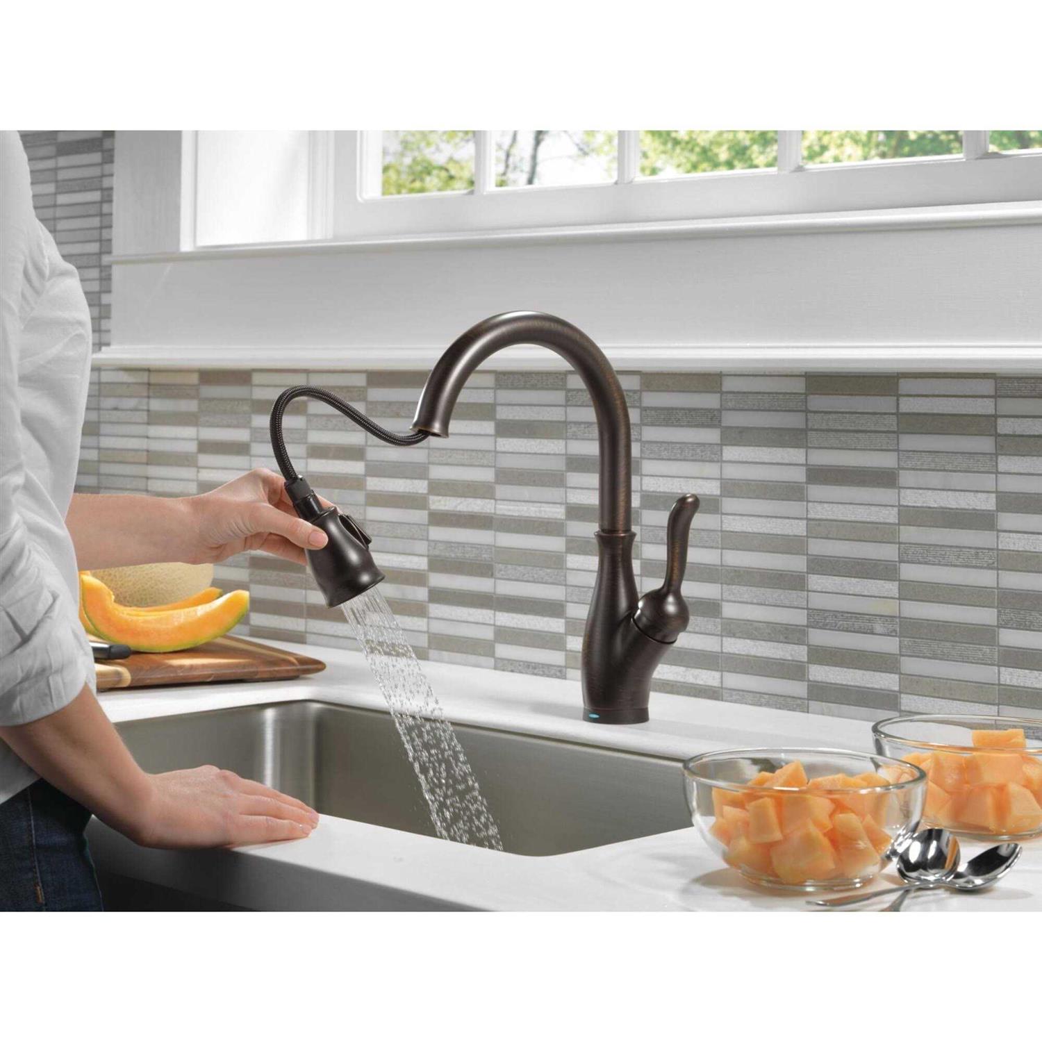 Whether you have two full hands or 10 messy fingers, Delta Touch2O Technology helps keep your kitchen faucet clean, even when your hands aren’t. A simple touch anywhere on the spout or handle with your wrist or forearm activates the flow of water. The Delta TempSense LED light changes color to alert you to the water’s temperature and eliminates any possible surprises or discomfort. Delta MagnaTite Docking uses a powerful magnet to set your pull down sprayer precisely into place so it stays docked when not in use. ShieldSpray Technology cleans with laser-like precision while containing mess and splatter. A concentrated jet powers away stubborn messes while an innovative shield of water contains the splatter, so you can spend less time soaking, scrubbing and shirt swapping. Delta SpotShield Technology helps to keep your kitchen faucet cleaner, longer by resisting water spots and fingerprints. Delta kitchen faucets with Diamond Seal Technology perform like new for life with a patented design which reduces leak points, is less hassle to install and lasts twice as long as the industry standard*. Kitchen sink faucets with Touch-Clean Spray Holes allow you to easily wipe away calcium and lime build-up with the touch of a finger. *Industry standard is based on ASME A112.18.1 of 500,000 cycles.