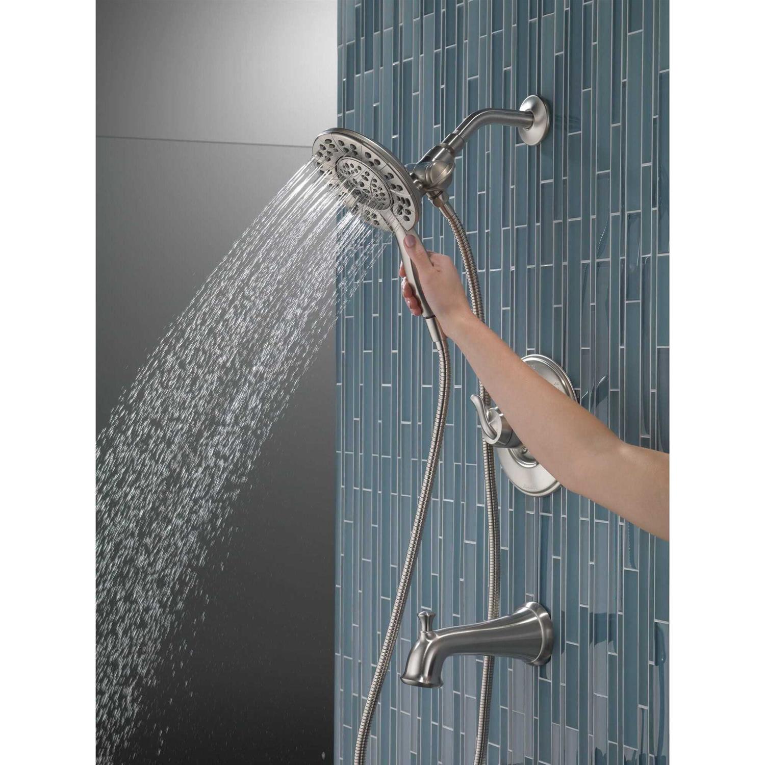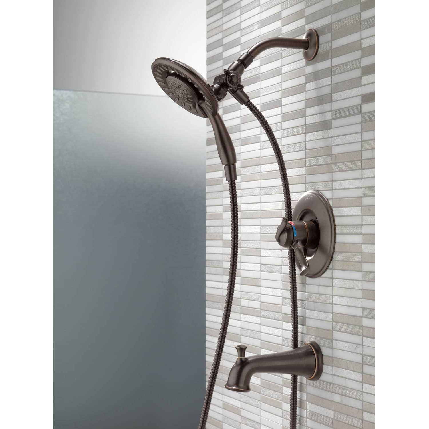Delta is more than just a brand of kitchen and bathroom faucets. It’s a name that represents what’s possible in today’s plumbing technologies. Every kitchen and bathroom in every home is unique, and with a wide range of pricing and features, Delta faucets and fixtures can meet every need. Rough In Valve Required Made in the U.S.A. Fully covered under Delta’s limited lifetime Superior finishing process faucet finish covered under lifetime The design was inspired by a strong presence in nature like that of tree with reaching branches With a full suite of products including matching accessories, the Linden Bath Collection complements most any bath Multi-function Intuition 2-in-1 shower head / hand shower combo Dual function cartridge separate volume and temperature controls Pressure balancing valve cartridge with scald guard Tub/Shower package includes: valve trim, shower head, shower arm, and tub spout Color: Brown.
