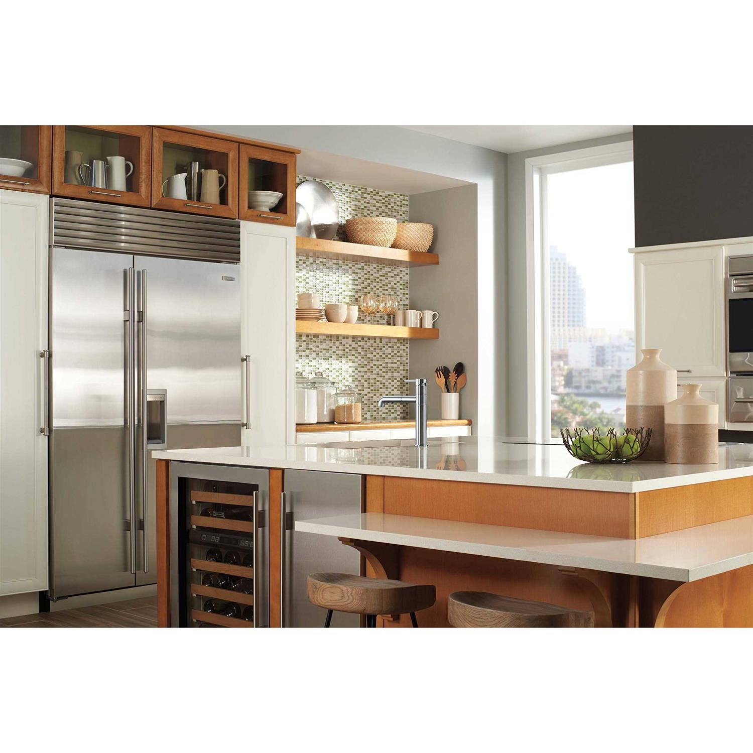 • Chrome finish faucet from Delta’s Trinsic collection provides modern convenience for the kitchen