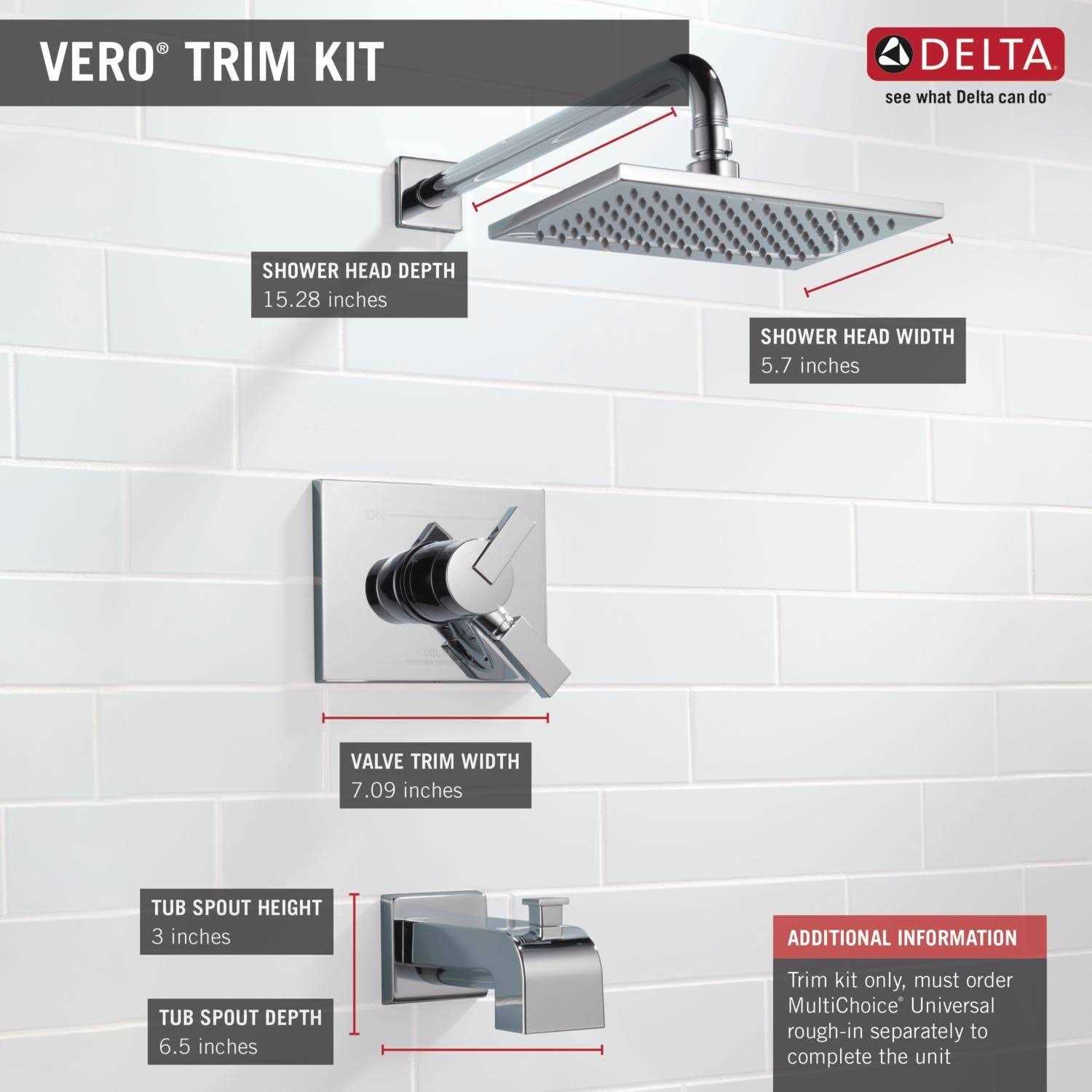 With separate handles for volume and temperature control, this Delta tub/shower provides a more refined showering experience. Simply set the water at your preferred temperature and turn the shower on or off with the volume control handle – without interrupting your set temperature. Designed to look like new for life, Brilliance finishes are developed using a proprietary process that creates a durable, long-lasting finish that is guaranteed not to corrode, tarnish or discolor. While other products may gather unsightly mineral build-up over time, Delta soft rubber Touch-Clean spray holes allow any mineral residue to simply be wiped away for an instantly refreshed look – with no need for soaking or the aid of chemical cleaners. Delta pressure-balance valves use Monitor Technology to protect you and your family from sudden temperature changes. Take the chill out of contemporary with the eloquent warmth of Champagne Bronze” in your bath. This vibrant, gold finish provides a vivid splash of contrast to your space for a look that’s simultaneously modern and nimble, able to pair elegantly with traditional, transitional and contemporary dcor. Monitor pressure balance valve keeps water temperature within a safe +/-3degrees F (+/-1.6degrees C), helping to protect you from sudden changes in hot or cold water pressure. Soft, rubber spray holes allow you to easily wipe away calcium and lime build-up from the spray face of your showerhead and hand shower with the touch of a finger. Trim kit only, must order MultiChoice Universal rough-in separately to complete the unit.