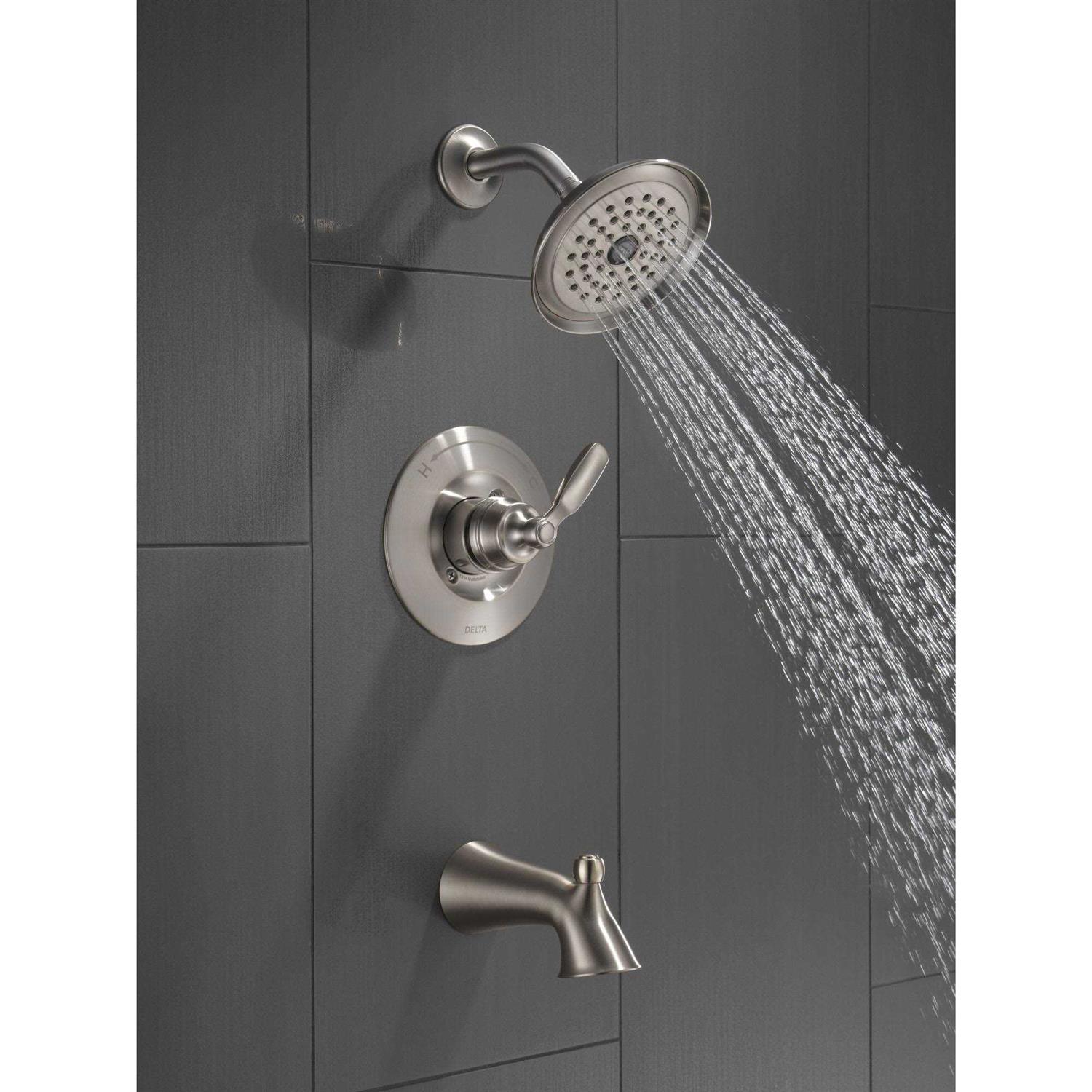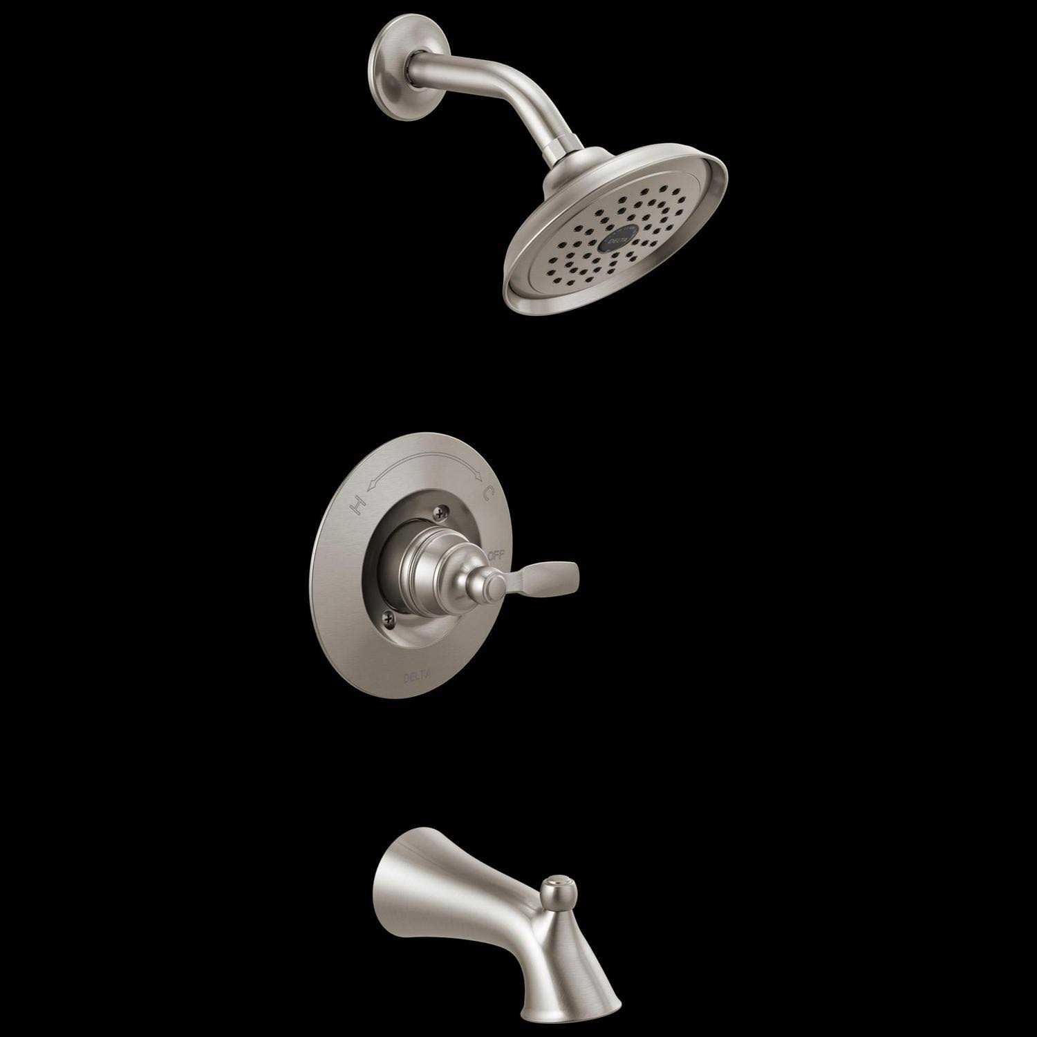 The Woodhurst Bath Collections refined style lends an alluring charm to your bath, while the button-cap detailing confers a classic familiarity. While other products may gather unsightly mineral build-up over time, Delta soft rubber Touch-Clean spray holes allow any mineral residue to simply be wiped away for an instantly refreshed look – with no need for soaking or the aid of chemical cleaners. Delta pressure-balance valves use Monitor Technology to protect you and your family from sudden temperature changes. This Brilliance Stainless finish has subtle, warm undertones which make it an excellent match with nickel or stainless steel and is extremely versatile, complementing nearly any look, be it traditional, transitional or contemporary. Delta WaterSense labeled faucets and showers use at least 20% less water than the industry standardsaving you money without compromising performance. Monitor pressure balance valve keeps water temperature within a safe 3 F (1.6 C), helping to protect you from sudden changes in hot or cold water pressure. Spray settings include: Full Body spray. Full body spray provides a steady, full-coverage spray perfect for every shower need, from rinsing shampoo from hair to relaxing tired muscles.