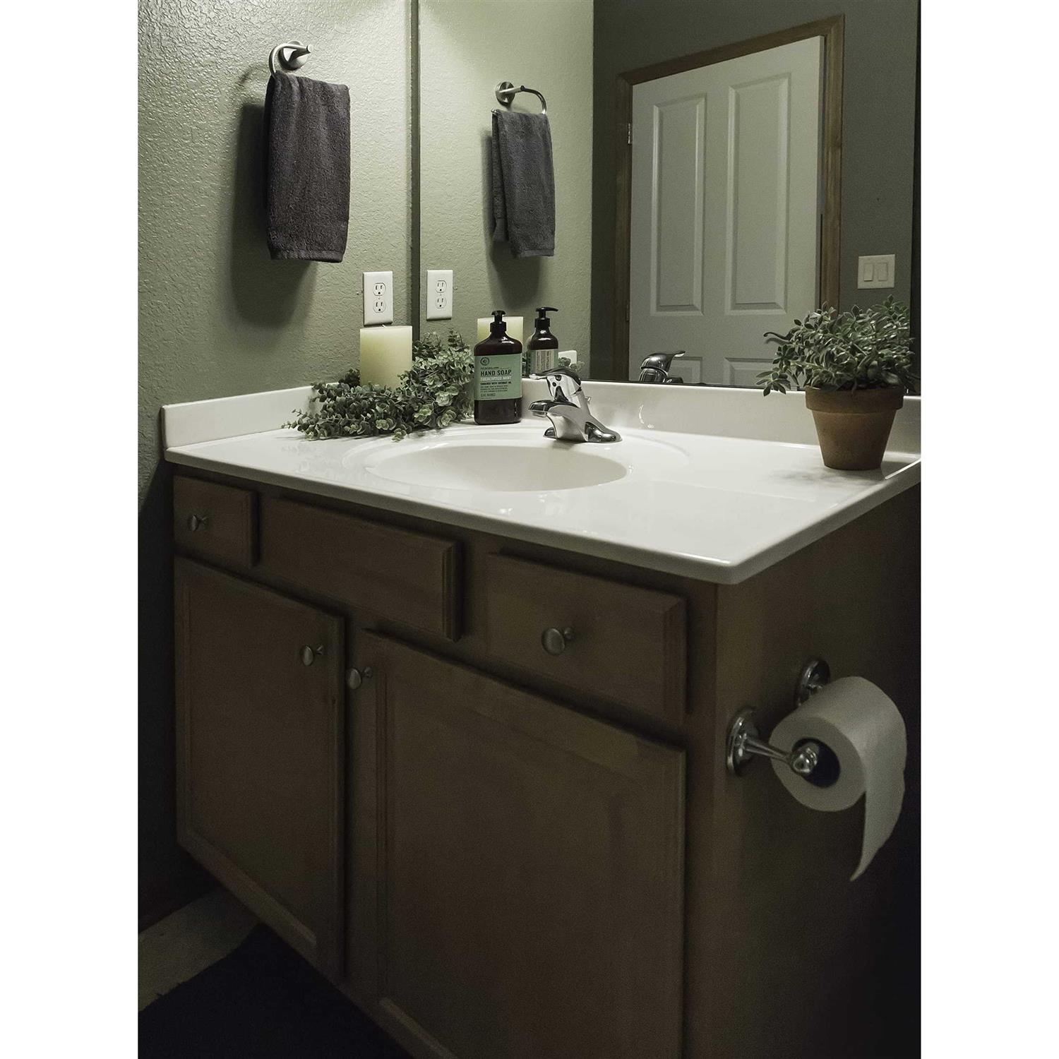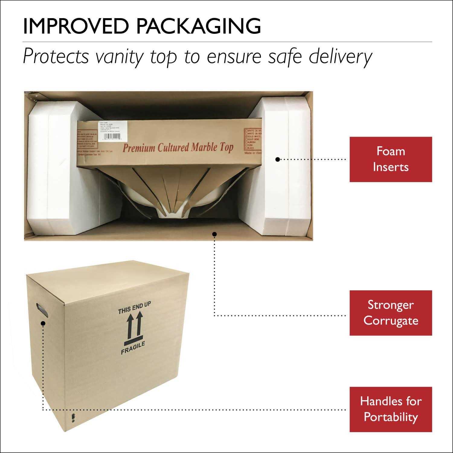 Give your bathroom that clean, classic look youve been searching for with the Design House 37 Cultured Marble Vanity Top with white on white finish. This spacious top features a drip free edge to help contain excess water and squared edges that evoke a more modern look. Three pre-drilled holes make installing a 4 centerset faucet easy and an integrated backsplash creates a barrier between your wall and the vanity to help prevent mold and water damage. The oval bowl at the heart of this top is integrated directly into the design for a seamless look.