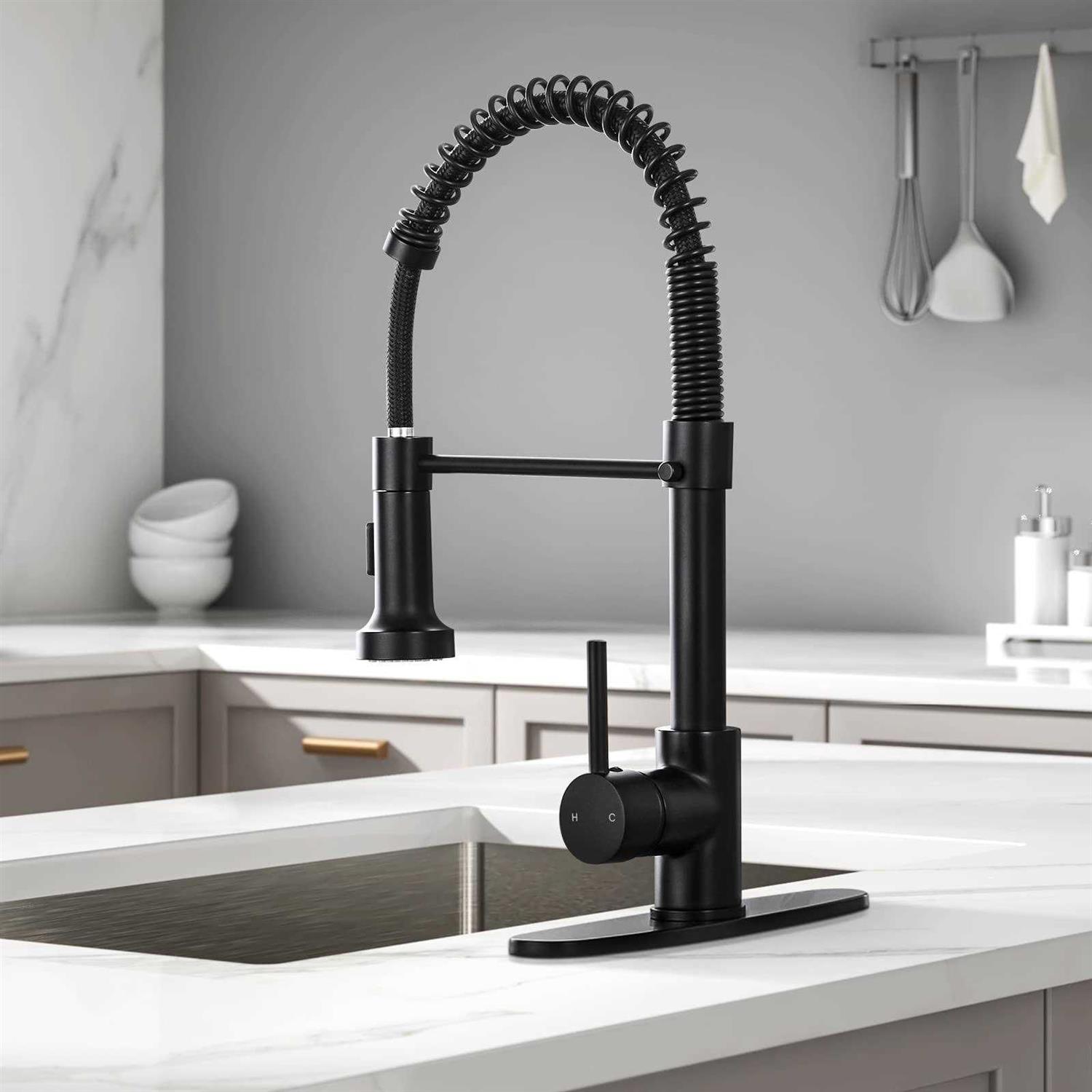 DJS Kitchen Faucets with Pull Down Sprayer ,Brass Black Single Handle Single Lever High Arc Spring Faucet with Deck Plate for 1 or 3 Holes Kitchen