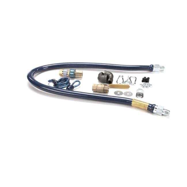Hook up your gas appliances and get cooking in a heartbeat with the Dormont 48″ 1650KIT48 SnapFast gas connector kit! This kit’s SnapFast device is a durable one-handed quick disconnect that installs easily by attaching it to the appliance inlet and your blue hose. When it’s time to clean your appliance SnapFast disconnects the gas flow for safe easy maintenance and then reconnects with just a push and a click. For added safety SnapFast has an internal thermal shutoff designed to shut off gas flow when temperature inside the fitting exceeds 350 degrees Fahrenheit. The restraining device attaches securely to your equipment and the wall of your facility to decrease strain on your gas hose as you move your unit out from the wall for cleaning and maintenance. A restraining system is required in most commercial kitchens. The Dormont blue gas hose included with this kit is made of woven corrugated 304 stainless steel tubing covered in an antimicrobial PVC coating that slows the growth of bacteria mildew and mold on the gas connector. The total length of the gas connector including hose and fittings is 48″.