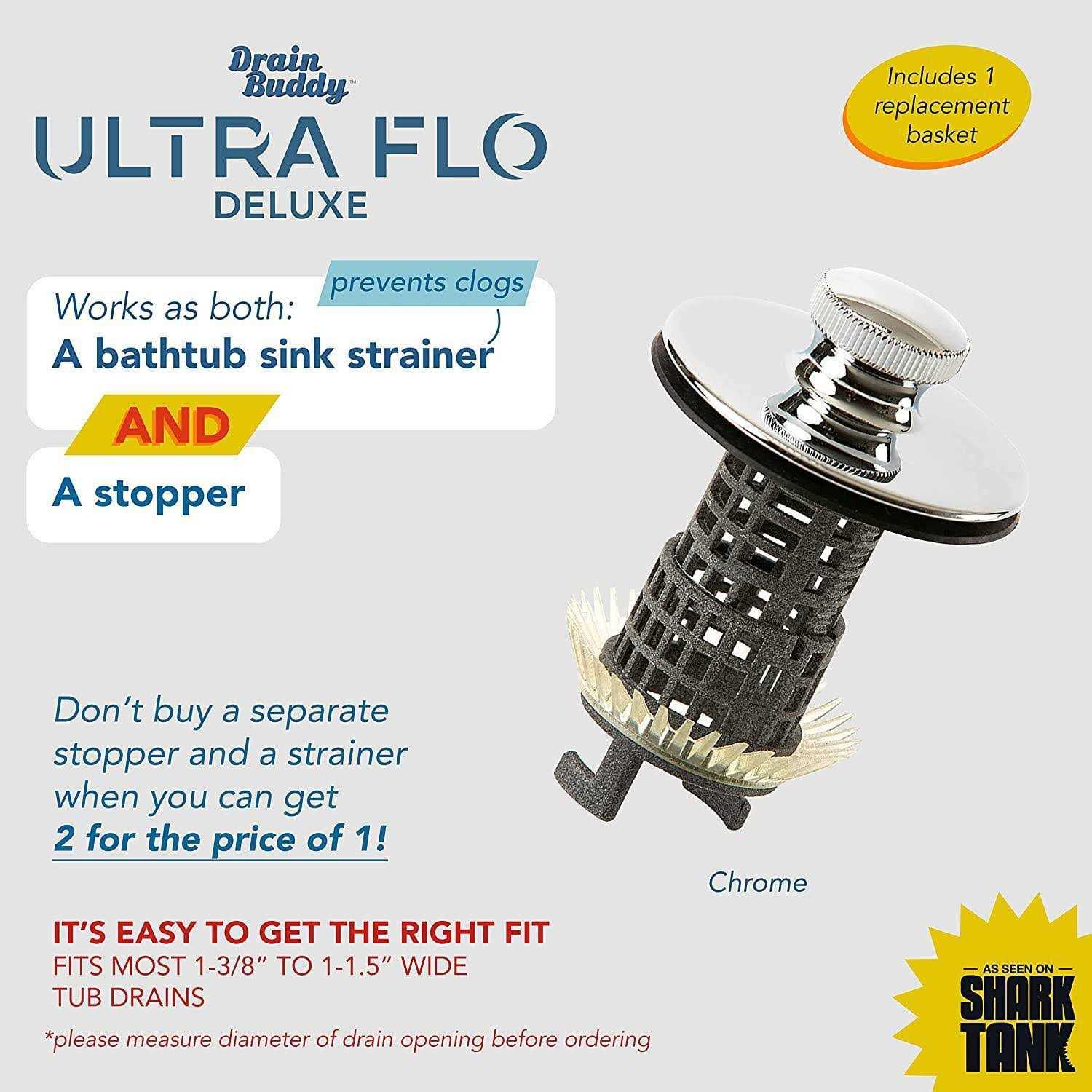 Prevent costly plumbing bills from clogged bathtub drains with the Drain Buddy Ultra Flo 2-in-1 Tub Stopper and Hair Catcher. No-installation setup.