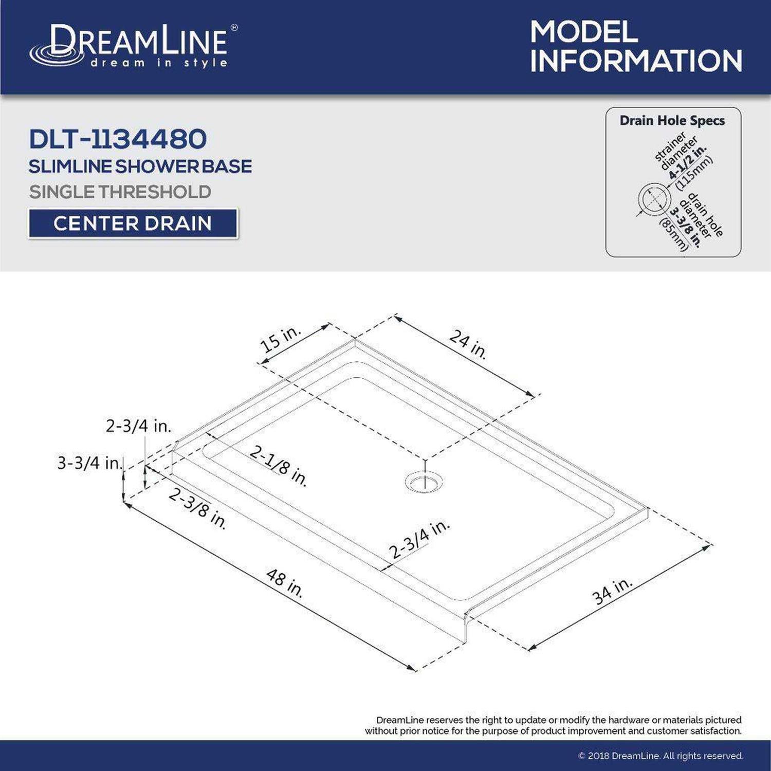 DreamLine DLT-1134480 Slimline 34 x 48 inch Single Threshold Shower Base Center Drain