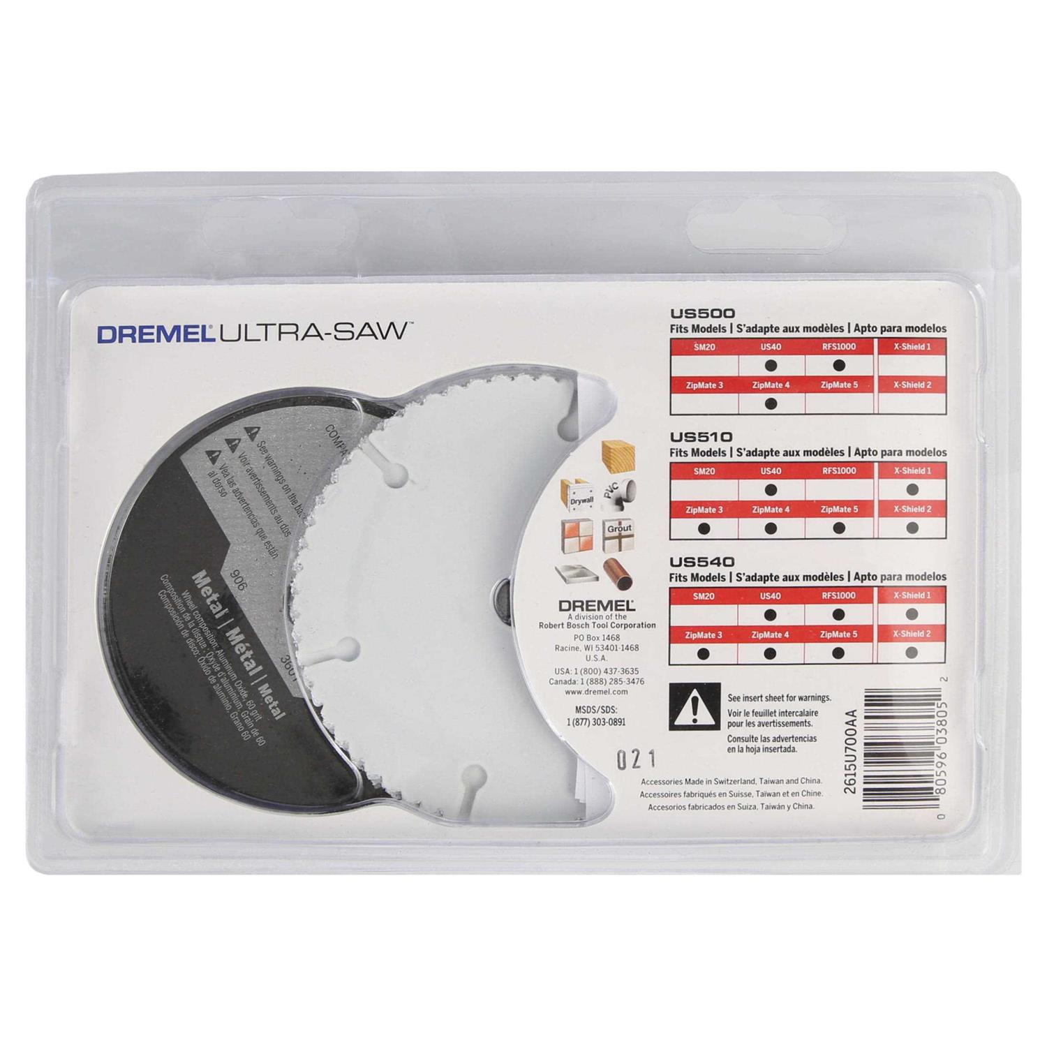 Versatile 6 piece cutting kit for drywall, wood, plastic, metal, tile and more. Kit Includes (1) US540 premium diamond tile cutting wheel, (2) US500 premium carbide Swiss Made wood cutting wheel, (3) US510 metal cutting wheels. US540 Diamonded coated cutting wheel for cutting wall tile, floor tile, porcelain, slate, stone, and cement backer board. US500 Premium Carbide Wheel for cutting a variety of woods and plastics. US510 Metal Cutting Wheel idea for cutting abrasive metal materials such as copper pipe, conduit, coated wire shelving, thin sheet metal, threaded rod, sheet aluminum and more. Compatible with all Dremel corded and cordless Ultra-Saws.
