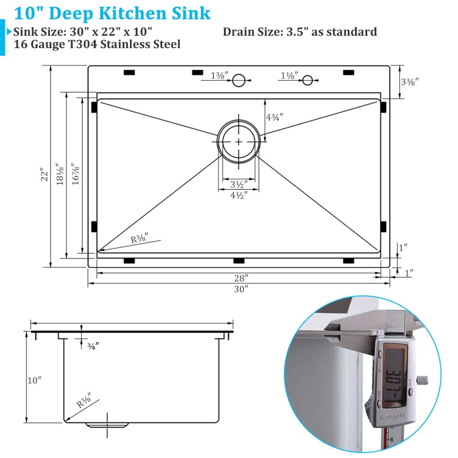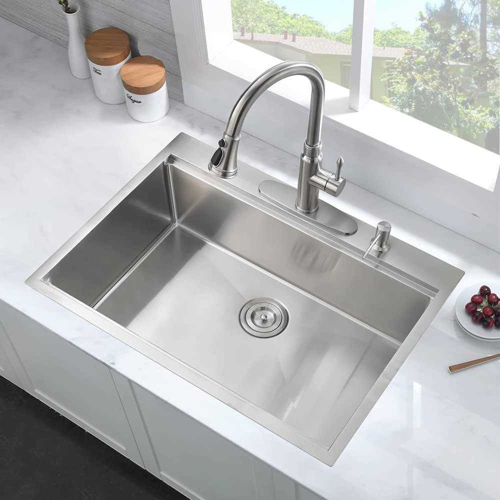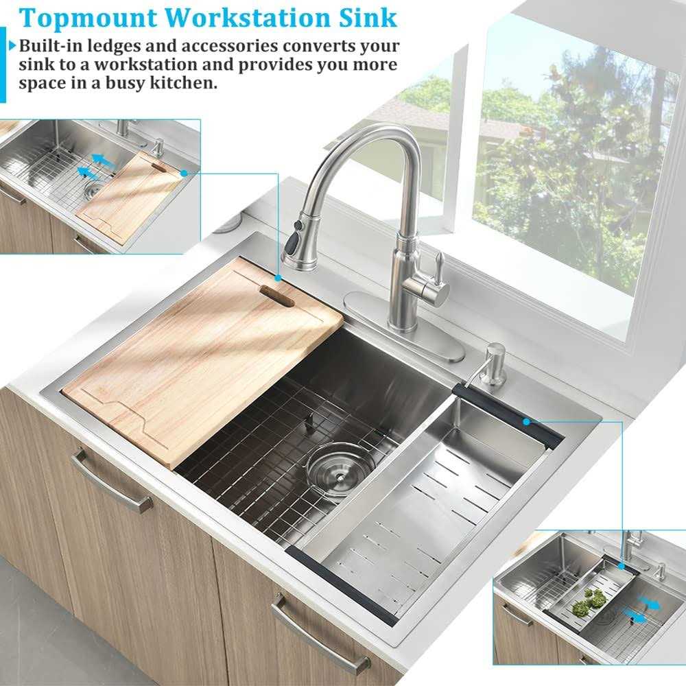 workstation Sink For More Space: Workstation Sink With Single-tier Track – Ledges On The Front And Back Provide A Track For Sliding The Built-in Accessories Such As A Solid Wood Cutting Board, Stainless Steel Colander, And Roll-up Dish Drying Rack. The Track Provides You With More Space To Use. indestructible & Durable Construction: The Sink Is Constructed By 16 Gauge T-304 Stainless Steel For Exceptional Resistance To Corrosion, Rust, And Scratches. Added R10 Design Could Let Your Wiping Reach To Each Corner. Easy To Clean And Long-lasting. heavy Duty Undercoating & Thick Rubber Padding: Extra Thick Rubber Dampening Pads Cover Over 80% Of Sink Base To Absorb Noise. And Heavy Duty Stone Guard Undercoating To Prevent Condensation And Protect Kitchen Cabinets. fast & Complete Drainage: Visible X-shaped Water Guideline On The Slightly Sloped Bottom Of Topmount Kitchen Sink Leads To Fast And Complete Drainage, No Blockage. Besides, Deep Single Bowl Prevents Splashing From Happening. package & Dimension: 30′ X 22′ X 10′ (minimum Cabinet Size Is 33′); Box Comes With Stainless Steel Kitchen Sink, Cutting Board, Stainless Steel Colander, Roll-up Dish Drying Rack, Bottom Rinse Grid, 3.5′ Basket Strainer Drain, Cutout Template And Topmount Installation Clips.