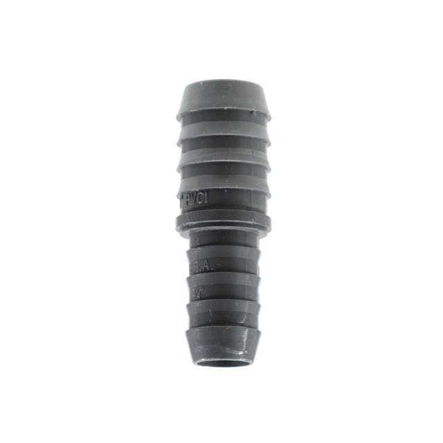 This is a gray PVC barbed reducing coupler. Use when you need to join one size tubing to another size tubing in a straight run.
