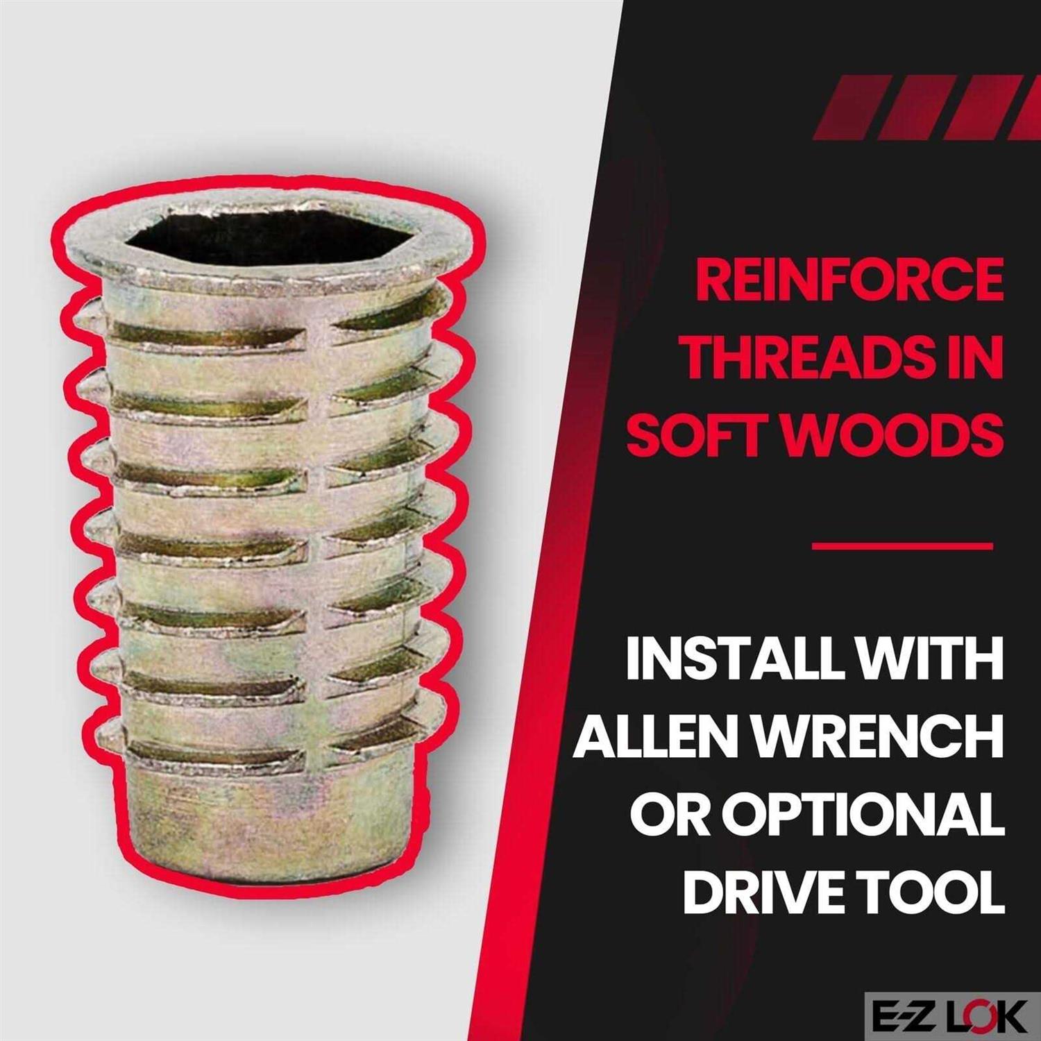 E-Z LOK Hex Drive inserts for soft wood are an inexpensive insert for use in ready-to-assemble furniture, drawer pulls, or wherever the avoidance of thread stripping is desired. Ideal for use in materials such as pine, plywood, composition board, and MDF, Hex Drive inserts feature tapered external threads which resist pull out caused by vibration. These die-cast zinc inserts are available in a flush design for “below the surface” installation or in a flanged design for installation depth limiting applications.