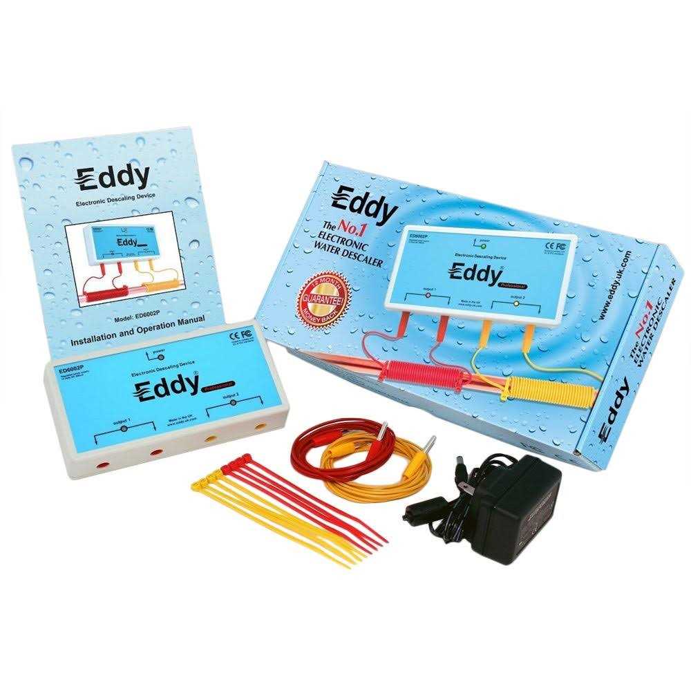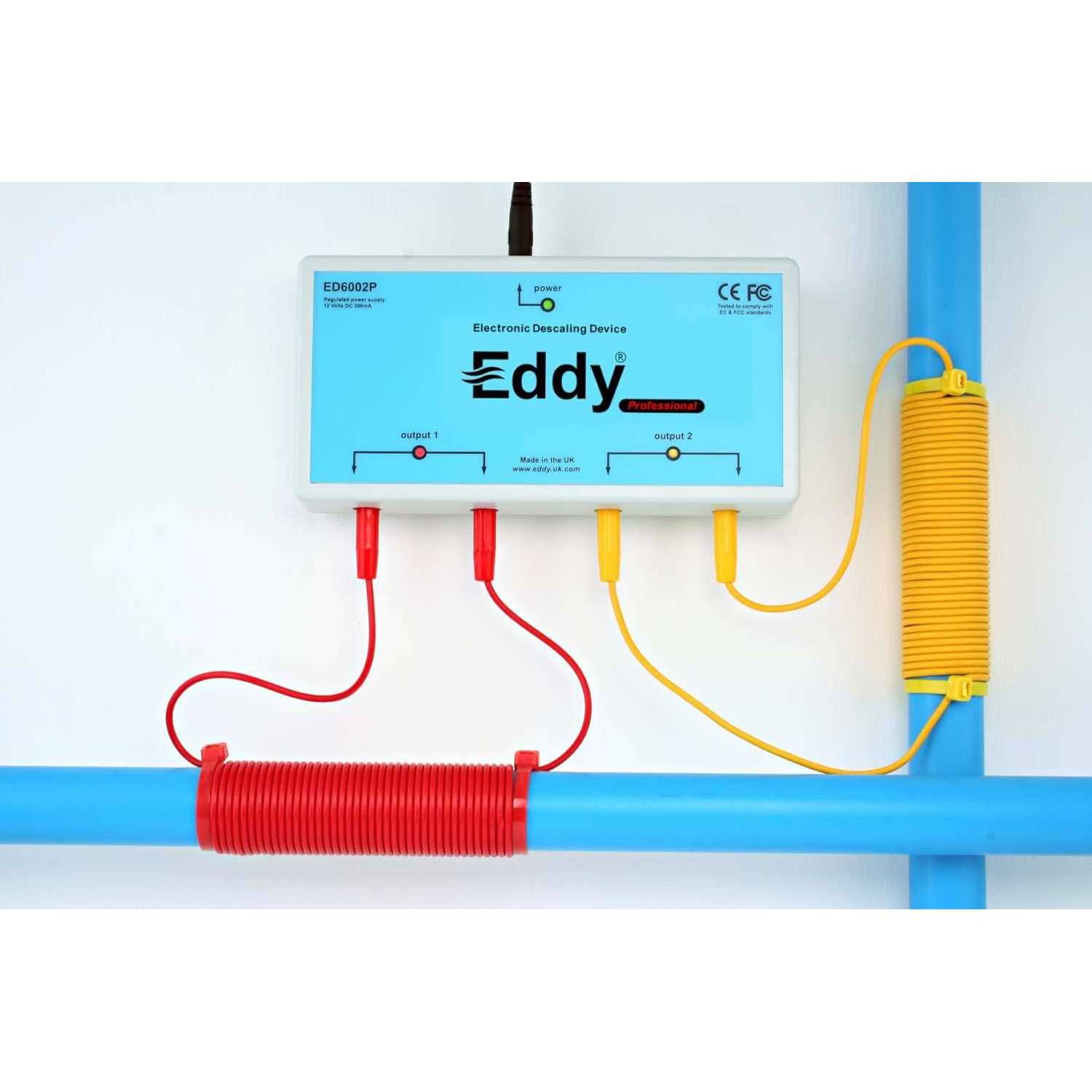Do you live in a hard water area and suffer from lime scale on sinks, faucets and showers? This is because your water supply contains dissolved magnesium, calcium, manganese compounds which appear as troublesome lime scale. They form into hard deposits settling on the surfaces of sinks, faucets, pipes and inside appliances, creating restrictions and greatly reducing the efficiency of water heaters and furnaces. Eddy is easy for anyone to fit, requires NO plumbing changes, does not require any salt and costs a fraction of the price of a conventional salt-fed water softener. Eddy produces a complex electro-magnetic wave which is applied through two coils placed round your incoming water supply pipe. In this way your water is subjected to an ever changing magnetic field as it passes through the coils. This alters the adhesion properties of the limescale so that it no longer deposits itself on your clean surfaces, inside pipework and appliances. Eddy does NOT alter the chemical hardness (TDS) of the water so the beneficial effects of the calcium and other particulates is retained – for example, calcium has been shown in medical tests to reduce incidence of heart disease. Eddy has been successfully used worldwide in thousands of homes and businesses for over 15 years, is highly economical and in most cases represents an easy eco-friendly alternative to salt-based water softeners. Thousands have been sold for use in homes and businesses. Buy with confidence. Comes with standard cables for pipe diameters up to 1.5 inches.