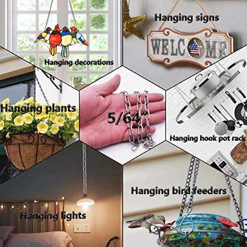 【Chain Size】5/64″ small chain: 0.71″x0.35″x0.07″(LxWxT), OAL: 6.5′ chain link. WLL: 80 lbs. 【Nicely Made】Glossy 304 stainless steel chain, durable, high abrasion resistance and long service life. 【Reliable】Much more lightweight and durable quality for the chain. They are tough and hard to cut. 【Easy to Connect】You can more quickly connect m4 spring snap, quick link or simple clamp to both ends of the chain. Working Load: 80 lbs. Broken Load: 160 lbs. Usage for hanging a plant, light, birdhouse, bird feeder, cloth, hook pot shelf, sign, mirror, dog leash, etc. br 5/32″ chain: /b It is medium. Usage for a swing, chair, punch bag, dog leash, large birdhous, good mooring chain for a boat, etc. br 1/4″ chain: /b It is thick and strong. Usage for hanging a swing, chair, basket, large birdhous, fence, tow chain, weightlifting, etc. br 5/16″ chain: /b It is thick and strong. Usage for tow chain, weightlifting, hanging a swing, chair, basket, fence, anchor your boxing bag, etc. br br What you get: /b br 6.5’/16.4′ 5/64″ br 6.5’/16.4′ 5/32″ br 6.5’/16.4′ 1/4″ br 6.5’/16.4′ 5/16″ 304 Stainless Steel Link Chain(The Length & Size you choose)