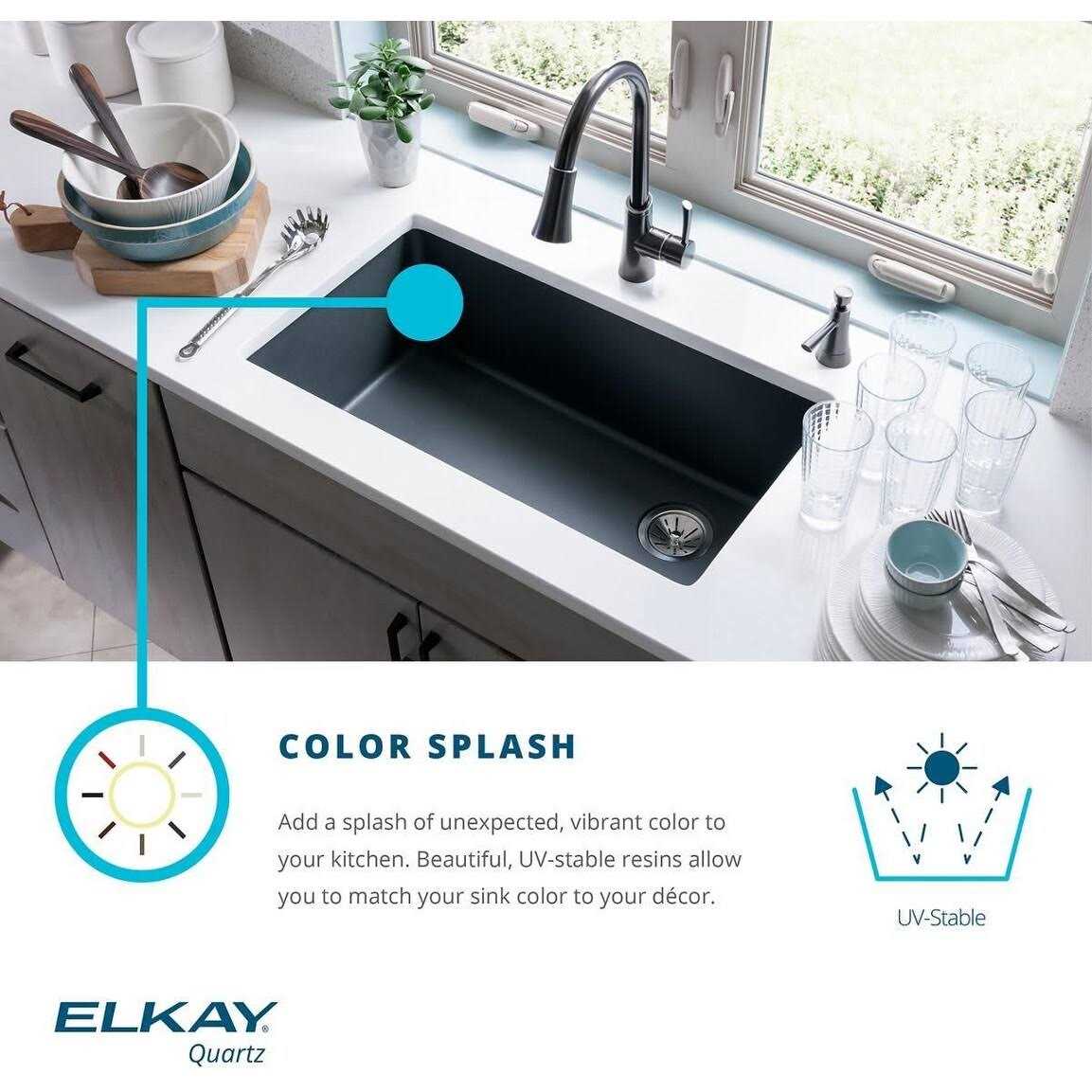 The ElkayELGU3322GY0 is an excellent choice as a highlight in your kitchen.Made from heavy-duty material, this rectangular sink can withstand daily rough and heavy usage. It is made from 80% natural quartz with high-performance acrylic resins thatresists the wear of time. The sink is designed for undermount installation.This Elkay ELGU3322GY0double bowl sink is from the Quartz Classic collection,designed for durability and functionality. This sink has no faucet hole. The 3-5/8″ drain openings are located at the rear center of the bowls (refer to the specification sheet). It requires a minimum of 36″ for the cabinet size. The exposed surfaces of this sink are made from a combination of materials that arenon-porous and stain-resistant with a Dusk Gray finish. Due to its inherent materials, the sink isnaturally sound-deadened.