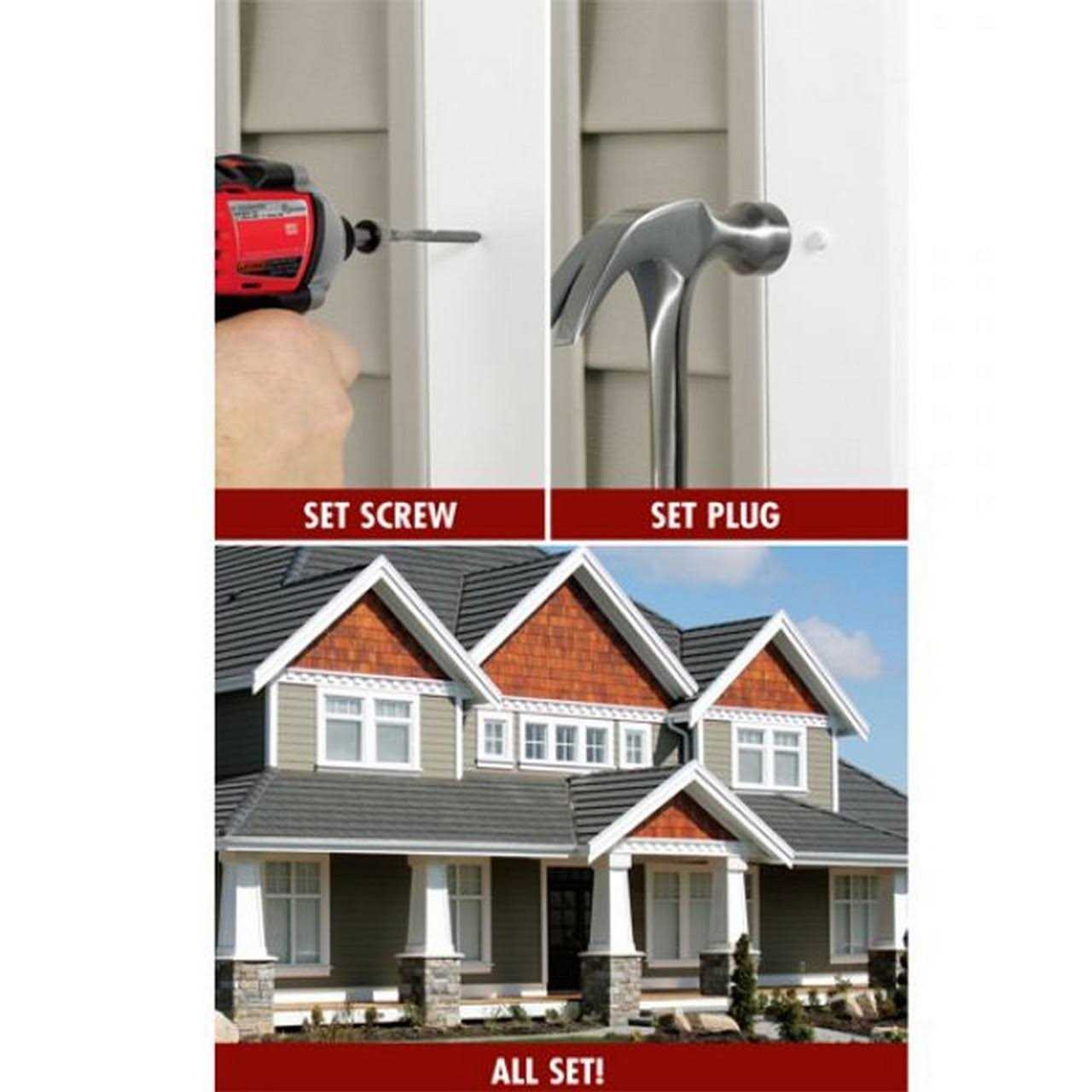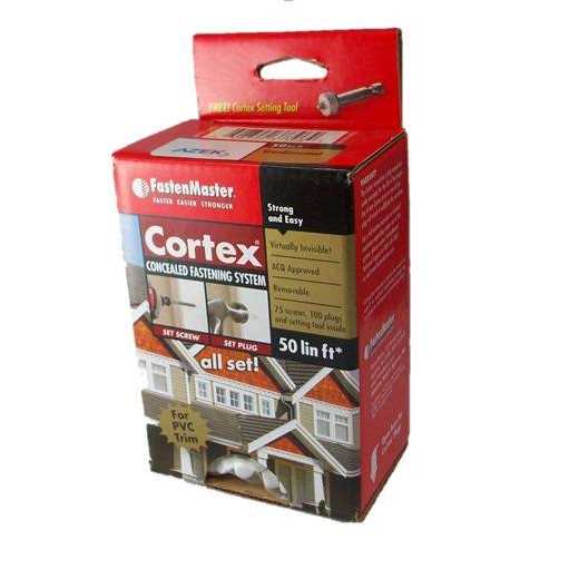 Azek Traditional Plugs 75 Screws, 2″ long and 100 Azek Traditional Plugs and 1 setting tool included Covers 50 lin ft of trim Plugs are made from manufacturer OEM trim boards, ensuring plugs match the trim Traditional Plugs are Smooth Cortex Concealed Fastening System for Azek Trim is a fast and easy way to conceal fasteners and screw heads when installing PVC trim Boards. Cortex is easy-to-use and includes everything needed, including screws, plugs and setting tools. FastenMaster recommends installing with an 18 volt cordless impact drill. The Cortex for Trim Fastening System is designed for use with PVC Trim with actual thickness of 5/8″ to 5/4″. How many fasteners are needed? Horizontal trim boards less than 12″ wide, use two Cortex fasteners at every framing member-rafter tail or wall stud. The screws should be 16″ OC or closer. Vertical trim boards (i.e., next to a door or a window), use two Cortex fasteners every 16″ OC or closer. If a trim board is 12″ or wider, use three screws. Each trim board must be fastened within two inches of the end of each board. Note: Predrilling is not required throughout the majority of the project. Predrilling is required when fastening within 1/2″ of the end of a board and at mitered joints. Use a 3/16″ drill bit for predrilled pilot holes.