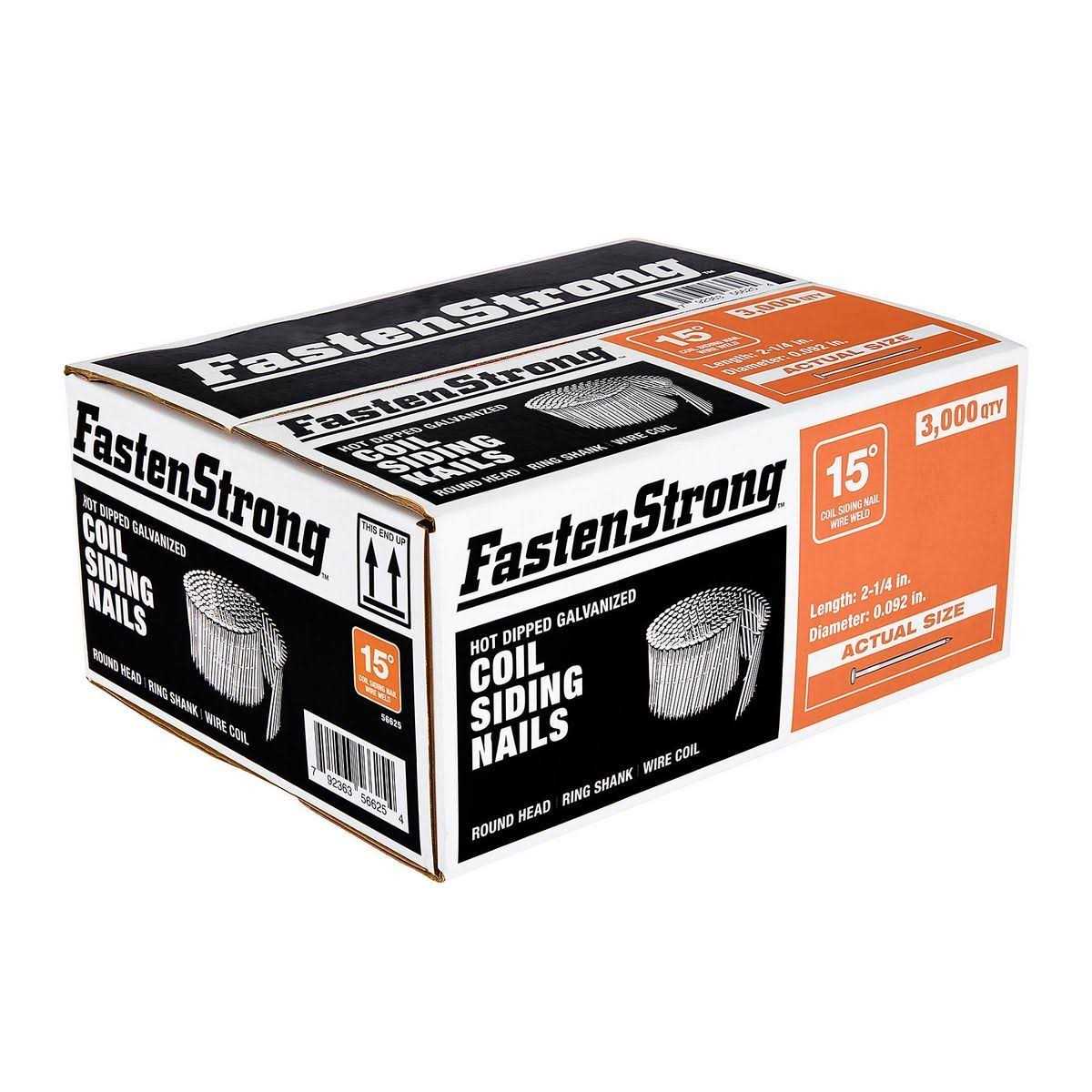 FASTENSTRONG galvanized coiled siding nails are designed for use in 15° siding nailers. The nails feature wire weld collation and a ring shank.