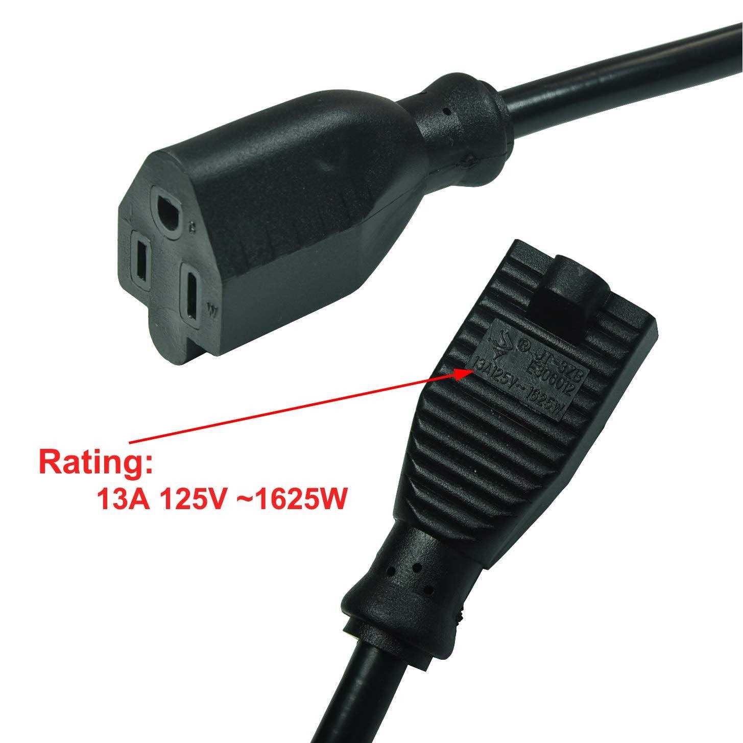 40CM 14 AWG, 13Amp 125Volt, 1625 Watts, UL Listed, With on off switch 14 AWG (13A) extension cords with thicker wire diameters, which can handle more amperage and thus more wattage, less chance of getting hot, is safer and more reliable compared with the thinner 16 AWG ones. This power cord is designed to give you a little extra reach. Great to plug in large adapters and plugs that won’t fit in your power outlet. Simply link the extension cords one at a time if the reach of plugs and cords are short for direct use. Marking on cord UL-Listed. 1 foot black cord in bag and created with the guarantee of quality and lifetime satisfaction.