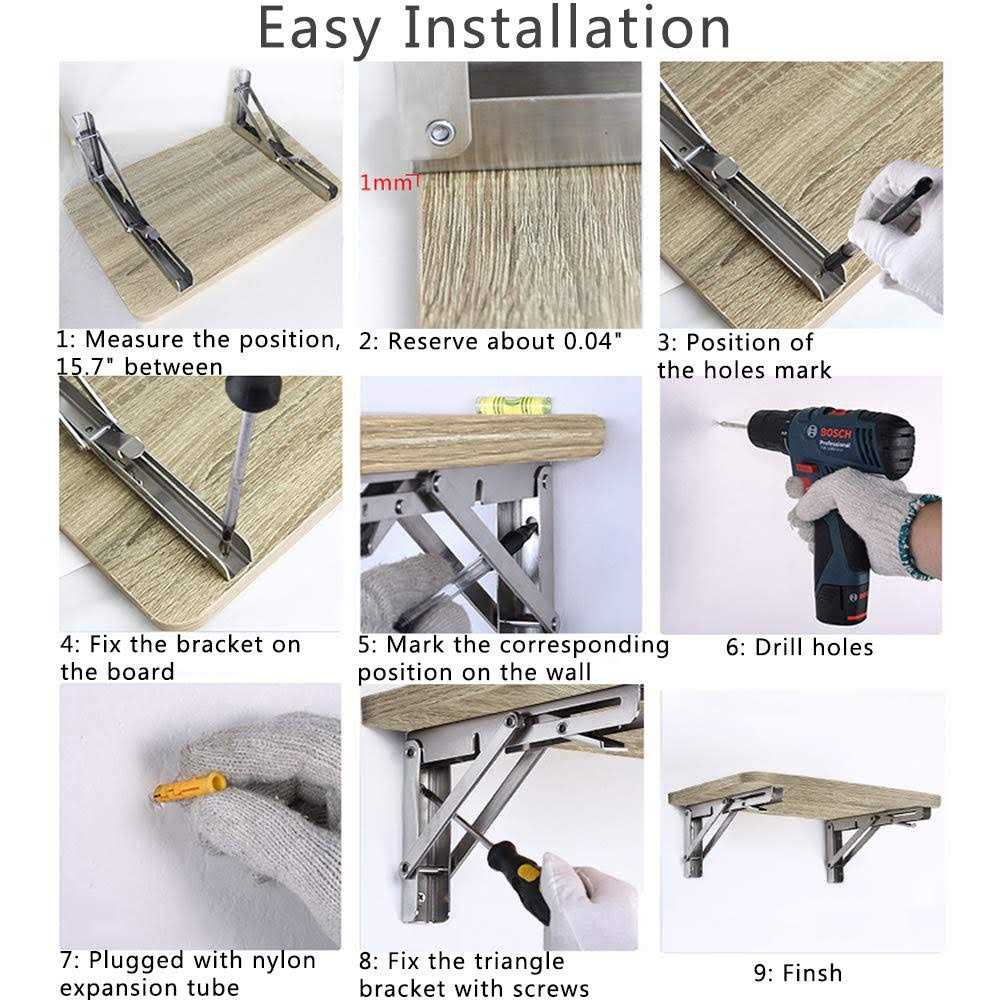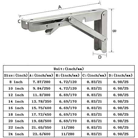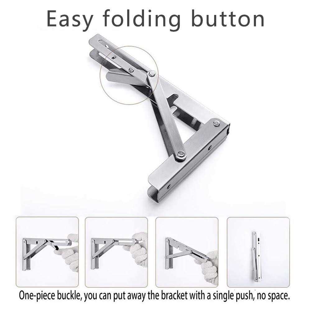 304 Stainless Steel 【Premium Quality】-The folding shelf brackets are made of premium polished 304 Stainless Steel. No paint off, more durable. Surface brushed treatment, build to resist daily scratches, corrosion and tarnishing. 【Space Saving】- These folding brackets are perfect for DIY jobs around the house. When not in use, you can fold the table to save space. Excellent performance, suitable for narrow spaces, if you need a worktop that can be folded down and to the side. Helps to keep your room in order. 【Easy installation】- The folding hinge brackets are easy to mount and fold. Comes with the mounting accessories.( Note: the board is not included) 【Wide Application 】- It can be used as bookshelf, kitchen shelf, exhibition stand, garden shelf, external wall bracket etc. Features: The Folding shelf brackets can be installed in kitchens, restaurants, rooms, shops, workshops, boats, RVs, backyards, trailers, balconies, bathrooms, garages, and can also be used to make TV stands, bookcase, folding stools, work benches, air conditioning frames, Booths, garden frames, laminated brackets, etc. FULL SIZES : Models include 8″/10″/12″/14″/16″/18″/20″/22″/24″folding brackets to meet different size requirements, all sizes will coming soon!