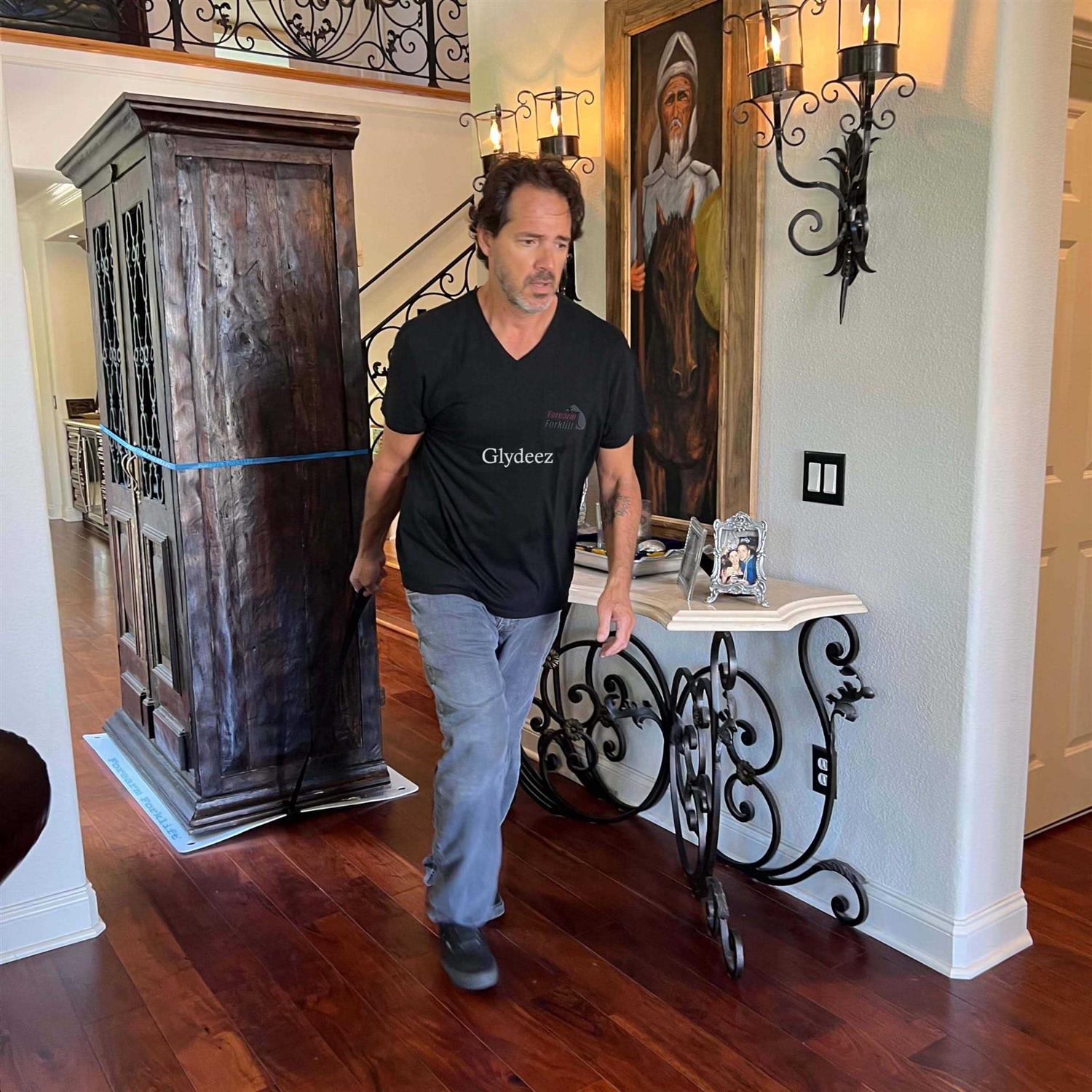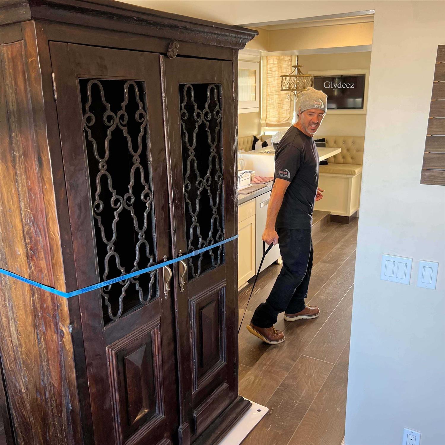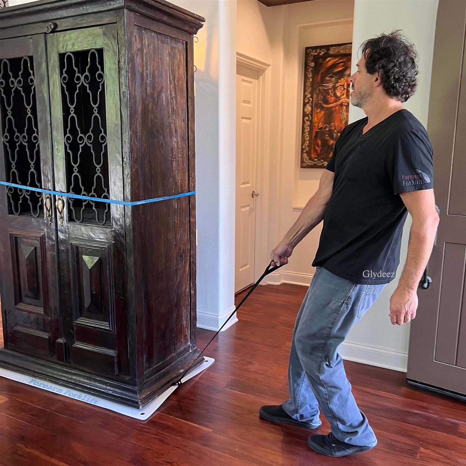 Forearm Forklift Glydeez now with a pull strap for easy use from a more upright position. Glydeez is a giant high-quality appliance glider thats perfect for sliding furniture and appliances if you’re by youself. This huge heavy duty mat is 48 x 29-7/8. It’s extremely durable because it’s made with impact resistant, thick, high-grade plastic. Protect hardwood or vinyl floors against scratches, gouges, tears or roller marks that can occur when sliding large appliances or furniture. Long lasting, convenient and ergonomic. The handle is 5 inches wide x 2 inches deep, so you can fit your hand through with ease, even with a glove on. Move your refrigerator, oven, dishwasher, stove, washer, dryer, china cabinet, entertainment center, dresser, wall locker or any other furnishing or appliance. Also great for toolboxes on a service call, unloading machines, etc.