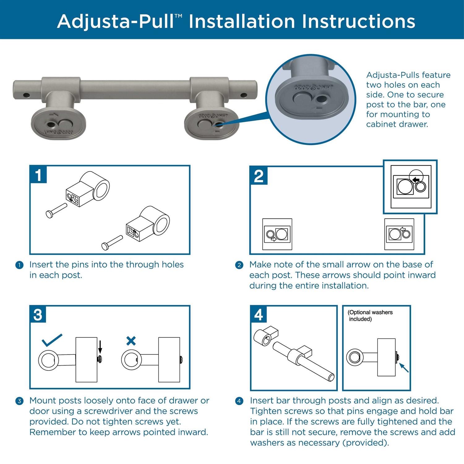 Looking for a unique size cabinet pull to fit old holes or cover an unfortunate drilling error? The Francisco Adjusta-Pull cabinet pull from Franklin Brass is an innovative handle that fits any hole measurement between 1-3/8 to 6-5/16 inches. Simply slide the pull over the screws and tighten them into place – no need for special hardware sizes, cabinet repair supplies, or drilling more holes.