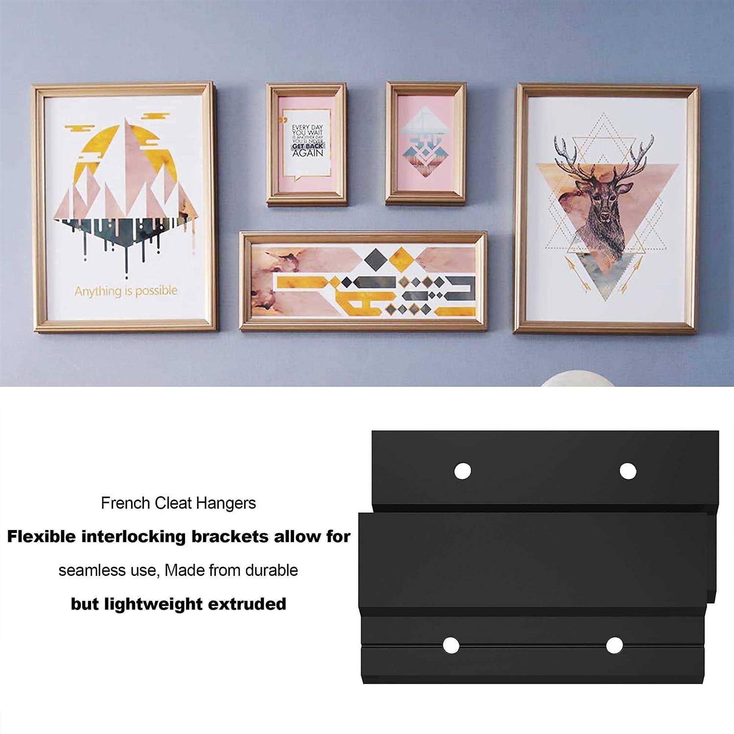 【High-strength load-bearing】The plywood hanger can support up to 20 pounds without tilting, and the mounting bracket can be used for many wall-mounted products. 【Efficiency and Safety】The French Cleat Picture Hanger Hardware Kit is made of high-strength, high-toughness ABS+ compound plastic, Load-bearing performance is better than ordinary hooks, making it an ideal choice for hanging heavy duty items. 【Easy to Install】The picture hanging hardware contains 2 screw holes, with expansion rubber plugs with long screws and Short screw, Use the matching spirit level to ensure that the cleats are level on the wall and your artwork. The elongated screw holes allow for fine adjustments during installationquickly. After the wall mount is installed, it can be easily moved, lifted and removed article.
